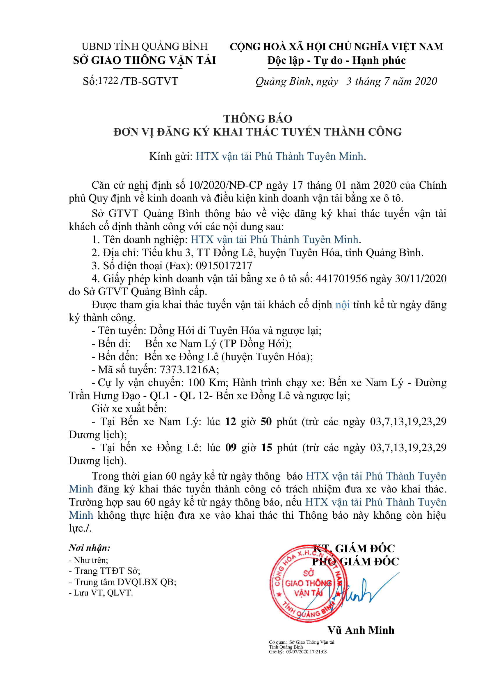 Thông báo Đăng ký khai thác tuyến thành công của HTX vận tải Phú Thành Tuyên Minh (TP. Đồng Hới - Huyện Tuyên Hóa và ngược lại)