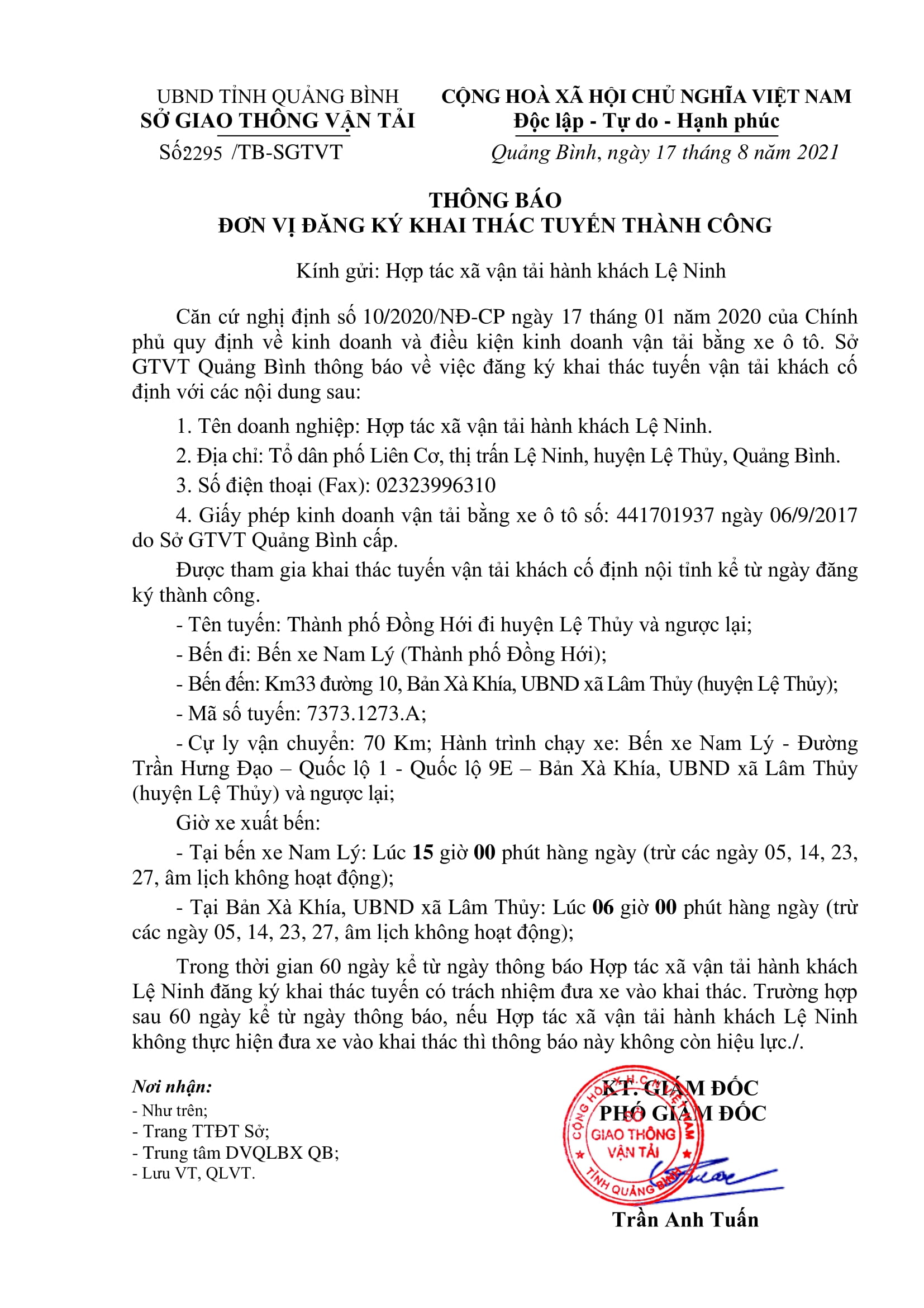 Thông báo Đăng ký khai thác tuyến thành công của Hợp tác xã vận tải hành khách Lệ Ninh (Tuyến : Thành phố Đồng Hới đi huyện Lệ Thủy và ngược lại)