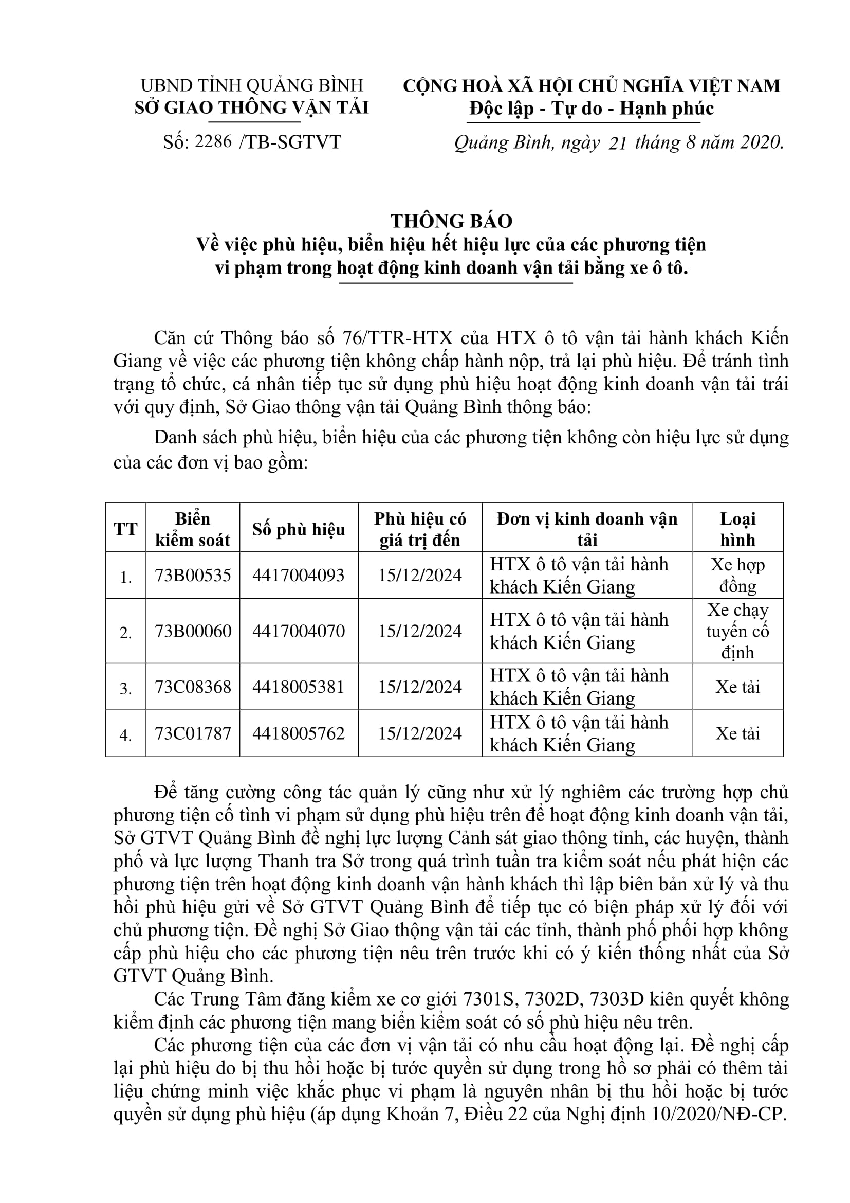 Thông báo Phù hiệu, biển hiệu hết hiệu lực của các phương tiện vi phạm trong hoạt động kinh doanh vận tải bằng xe ô tô
