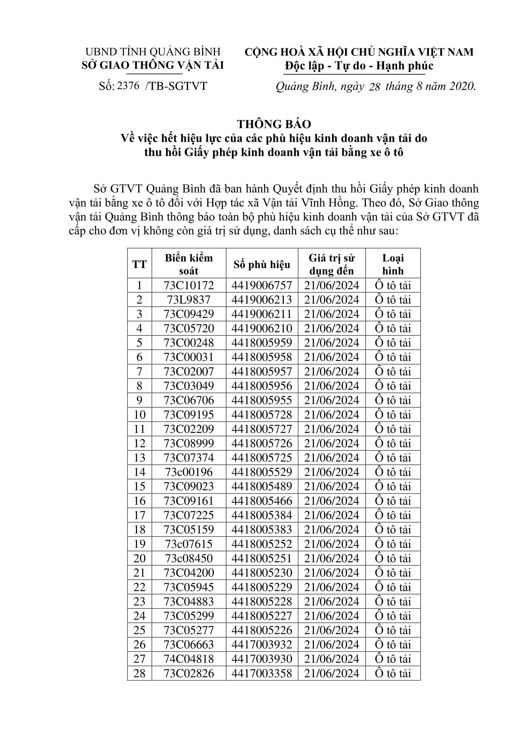 Thông báo hết hiệu lực của các phù hiệu kinh doanh vận tải do thu hồi GPKD vận tải bằng xe ô tô