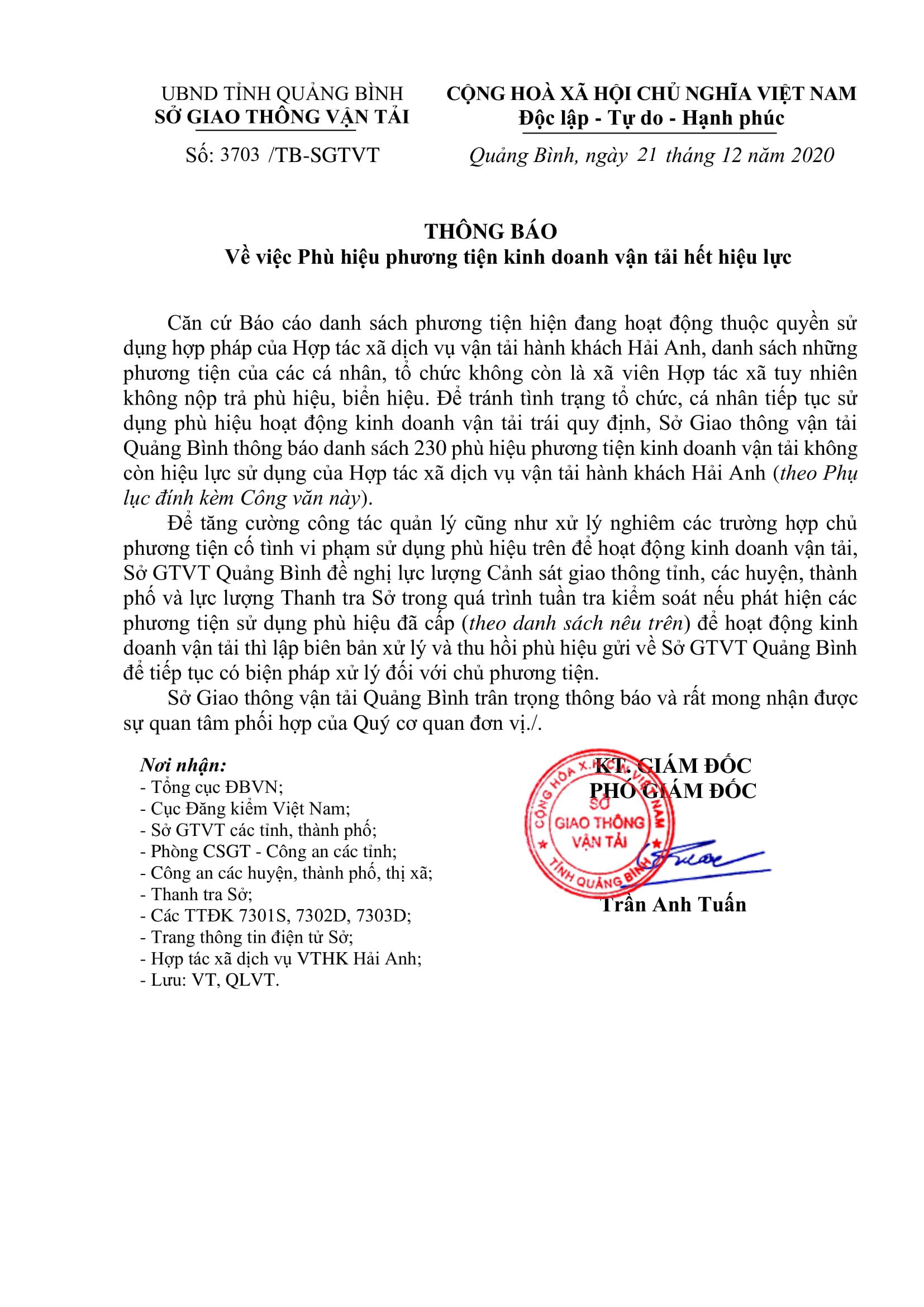 Thông báo Phù hiệu phương tiện kinh doanh vận tải hết hiệu lực của HTX Hải Anh