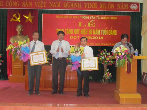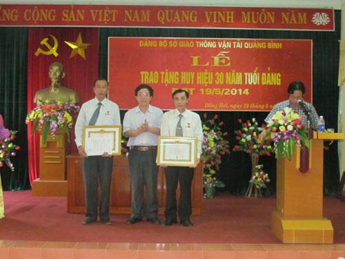 Kỷ niệm 124 năm ngày sinh của Chủ tịch Hồ Chí Minh, ngày 19 tháng 5 năm 2014 Đảng bộ Sở Giao thông vận tải Quảng Bình tổ chức Lễ trao Huy hiệu 30 năm tuổi Đảng cho Đồng chí Nguyễn Văn Liên - Chánh Văn phòng Ban an toàn giao thông tỉnh Quảng Bình và đồng chí Nguyễn Trường Lâm - Giám đốc Trung tâm Dịch vụ và Quản lý Bến xe khách Quảng Bình. Đồng chí Nguyễn Kim Long - Ủy viên Ban Thường vụ, Trưởng Ban Tổ chức Đảng ủy Khối Các cơ quan tỉnh đã phát biểu chúc mừng và yêu cầu 2 đồng chí được nhận huy hiệu tiếp tục phấn đấu, rèn luyện, nâng cao phẩm chất của người Đảng viên; Đồng chí Phạm Quang Hải - Bí thư Đảng ủy, Giám đốc Sở đã tặng hoa chúc mừng; Đồng chí Nguyễn Văn Liên phát biểu cảm tưởng vinh dự, tự hào khi được tặng Huy hiệu 30 năm tuổi Đảng và xin hứa tiếp tục tu dưỡng, rèn luyện, học tập và làm theo Tấm gương đạo đức Hồ Chí Minh, xứng đáng với phần thưởng cao quý được Đảng trao tặng./.