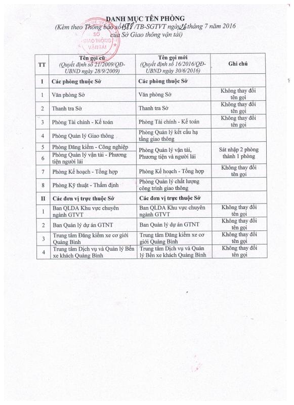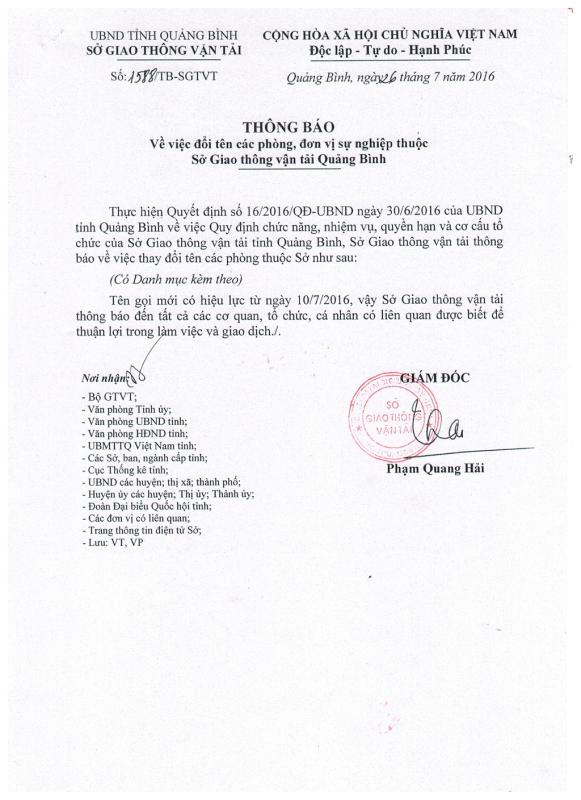 - Quyết định Quy định chức năng, nhiệm vụ, quyền hạn và cơ cấu tổ chức của Sở Giao thông vận tải tỉnh Quảng Bình (21/07/2016)