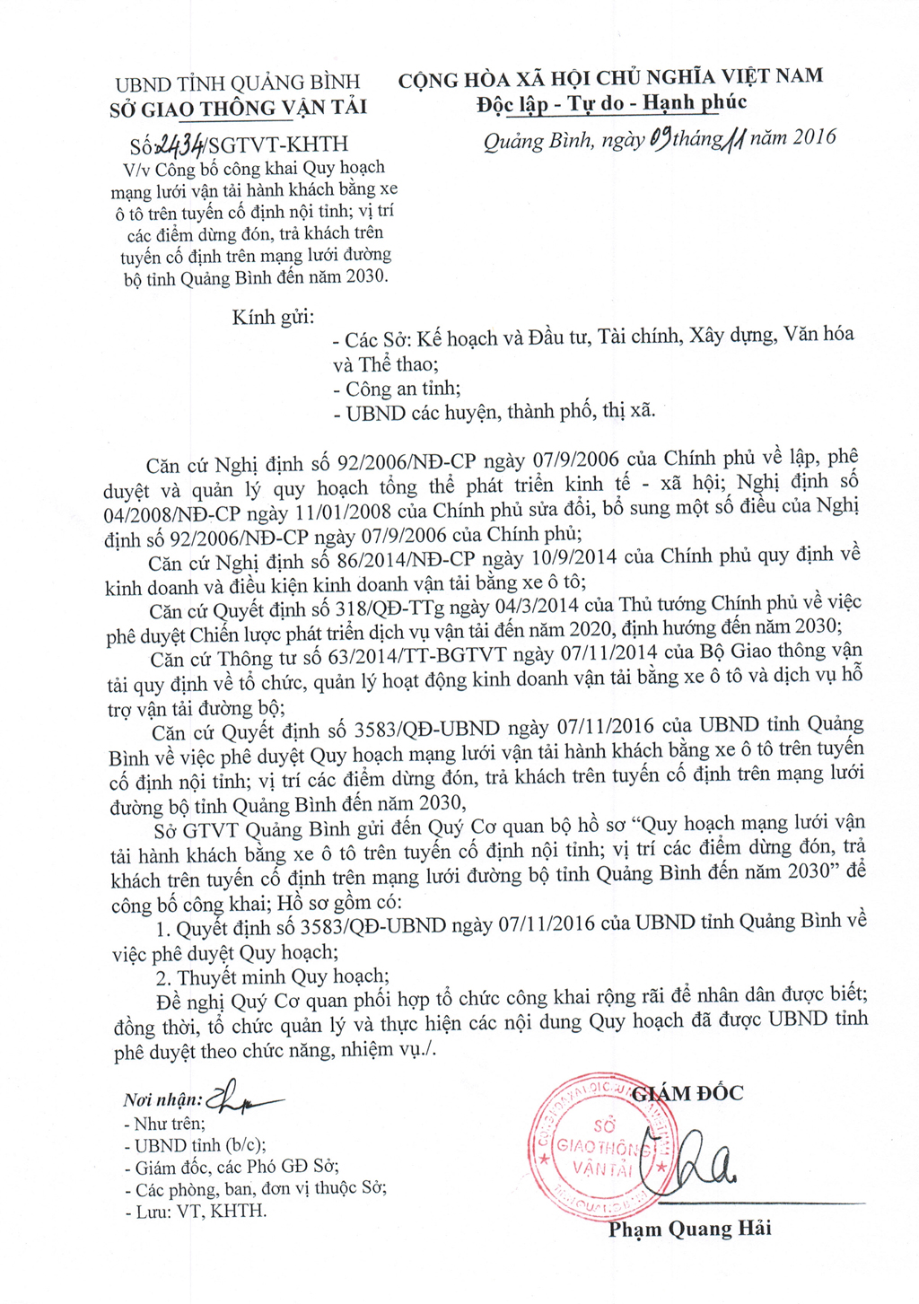 Công bố công khai Quy hoạch mạng lưới vận tải hành khách bằng xe ô tô trên tuyến cố định nội tỉnh; vị trí các điểm dừng đón, trả khách trên tuyến cố định trên mạng lưới đường bộ tỉnh Quảng Bình đến năm 2030.