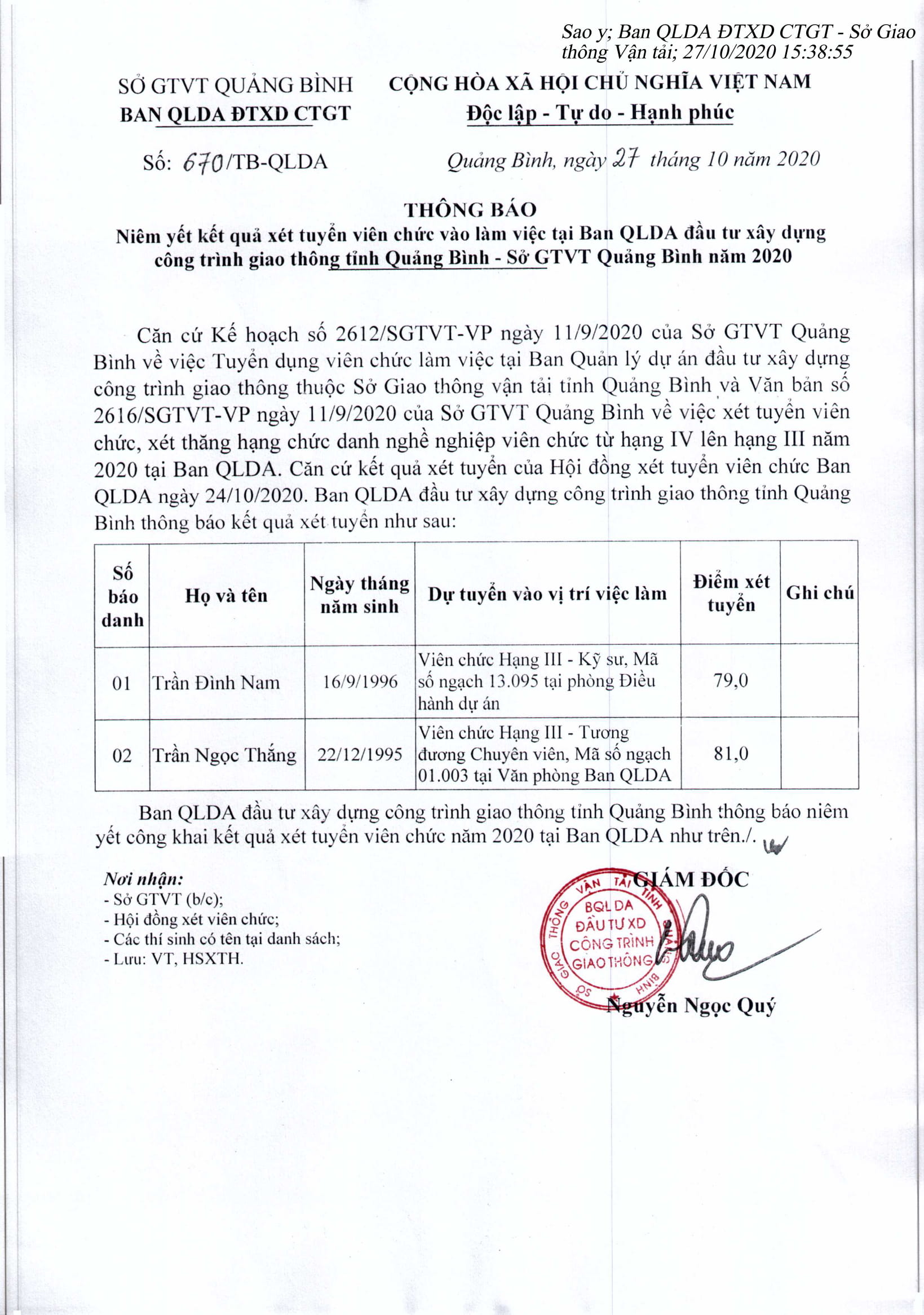 Thông báo kết quả xét tuyển viên chức vào làm việc tại Ban QLDA Đầu tư xây dựng công trình giao thông tỉnh Quảng Bình - Sở GTVT Quảng Bình năm 2020