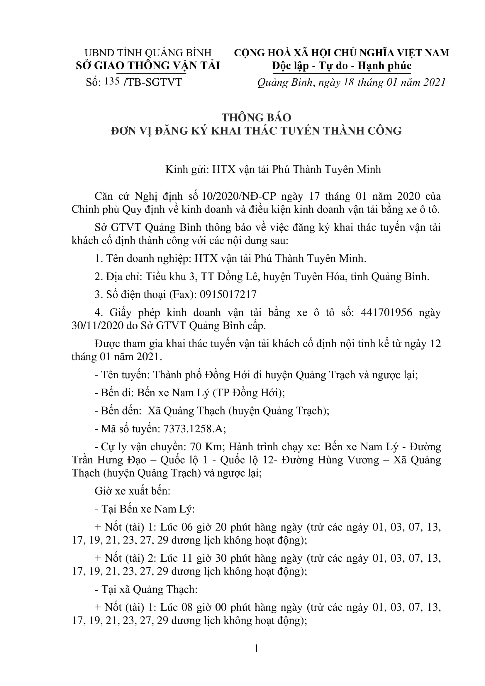 Thông báo Đăng ký khai thác tuyến thành công của HTX vận tải Phú Thành Tuyên Minh (Thành phố Đồng Hới đi huyện Quảng Trạch và ngược lại)