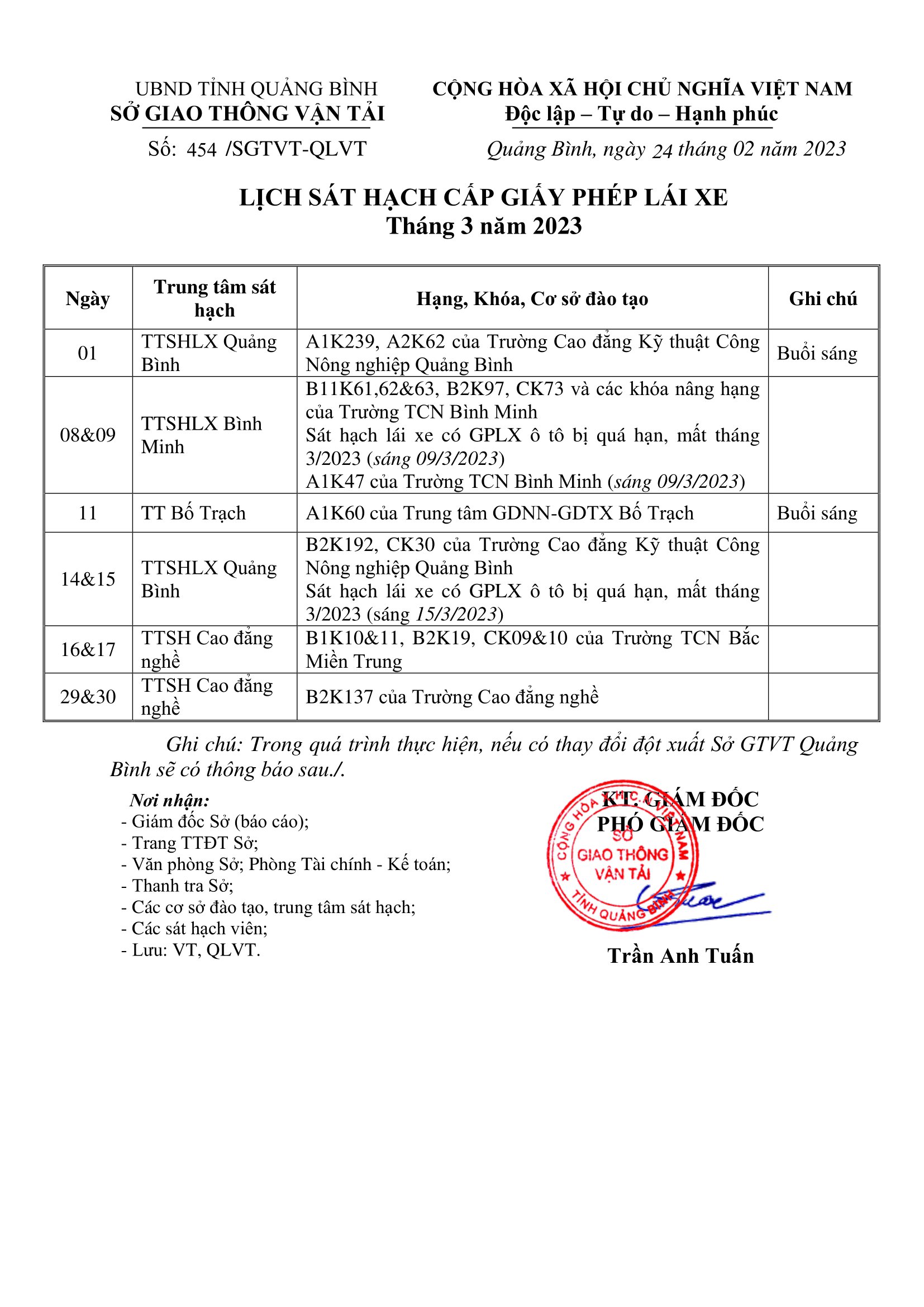 Lịch sát hạch Giấy phép lái xe tháng 03/2023