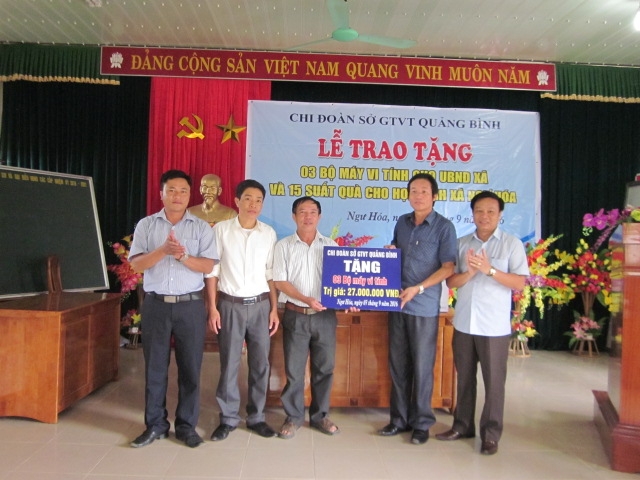 Sáng ngày 07/9/2016, Ban Chấp hành Chi đoàn Sở GTVT Quảng Bình đã tổ chức thăm và tặng quà tại xã Ngư Hóa - huyện Tuyên Hóa, cùng tham gia có đại diện Đảng ủy và một số đồng chí trưởng, phó phòng của Sở; trong đợt này, Chi đoàn đã trao 03 bộ máy vi tính, máy in cho UBND xã Ngư Hóa với giá trị 27 triệu đồng và tặng 15 suất quà cho 15 em học sinh Trường Tiểu học và Trung học cơ sở Ngư Hóa có hoàn cảnh đặc biệt khó khăn nhân dịp năm học mới với giá trị 03 triệu đồng. Tổng giá trị trao tặng là 30 triệu đồng, lấy từ nguồn kinh phí công trình Thanh niên do Chi đoàn đảm nhận thực hiện trong năm 2016.