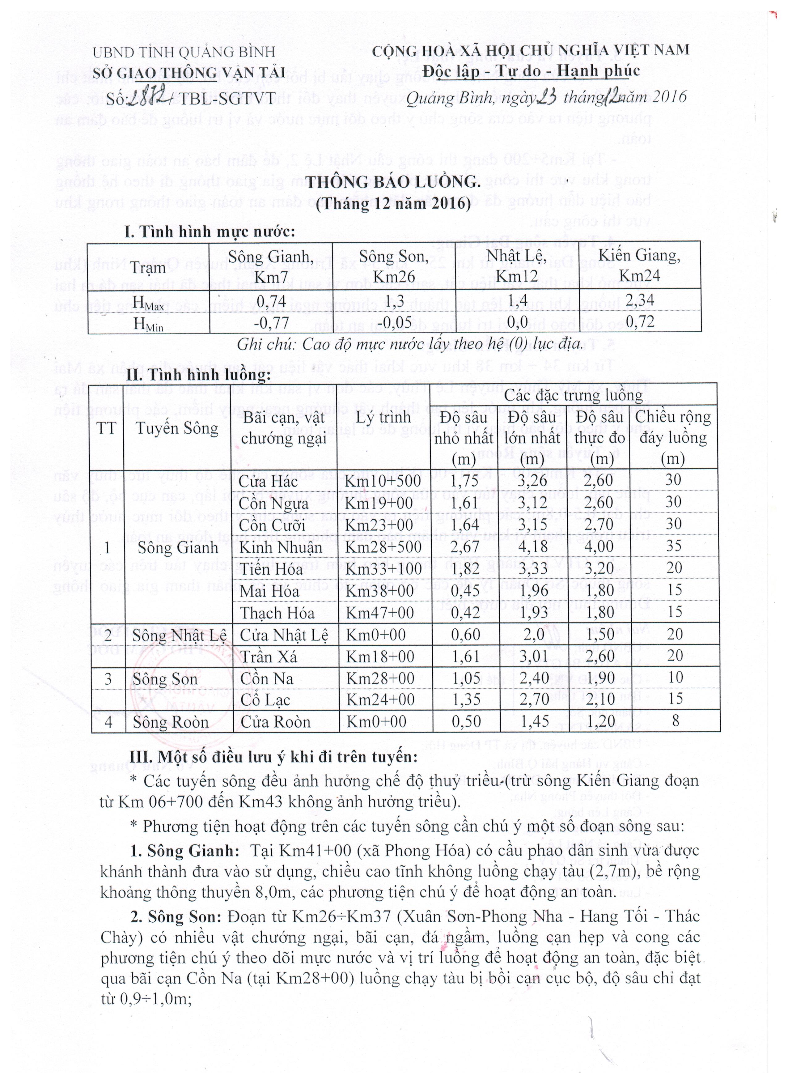 Thông báo luồng Đường thủy nội địa tháng 12/2016