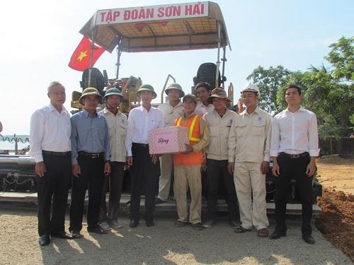 Đồng chí Trần Văn Luận - Phó Giám đốc Sở, Chủ tịch Công đoàn ngành tặng quà công nhân Công ty TNHH Tập đoàn Sơn Hải thi công gói thầu 14 Dự án nâng cấp mở rộng Quốc lộ 1