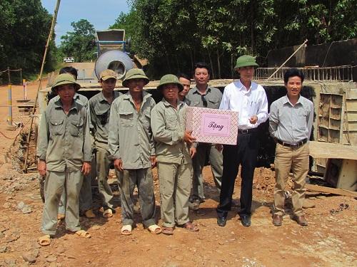 Đồng chí Trần Văn Luận - Phó Giám đốc Sở, Chủ tịch Công đoàn ngành tặng quà công nhân Công ty cổ phần Xây dựng tổng hợp 2 Quảng Bình thi công Dự án nâng cấp Tỉnh lộ 16.
