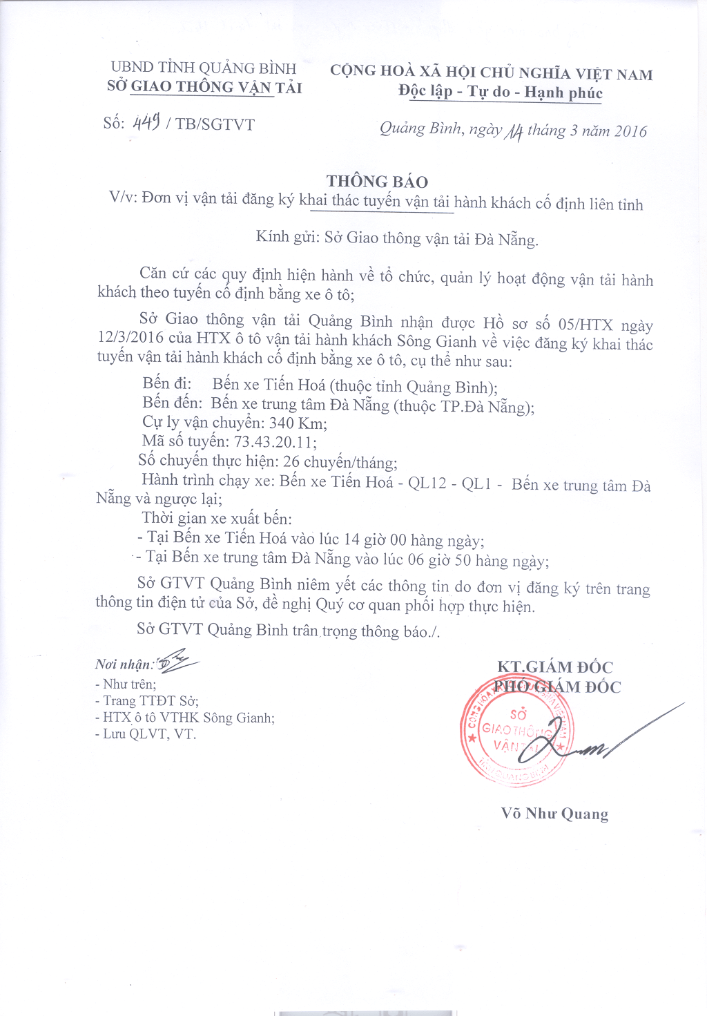 Đăng ký khai thác tuyến vận tải hành khách cố định liên tỉnh của HTX ô tô vận tải hành khách sông Gianh