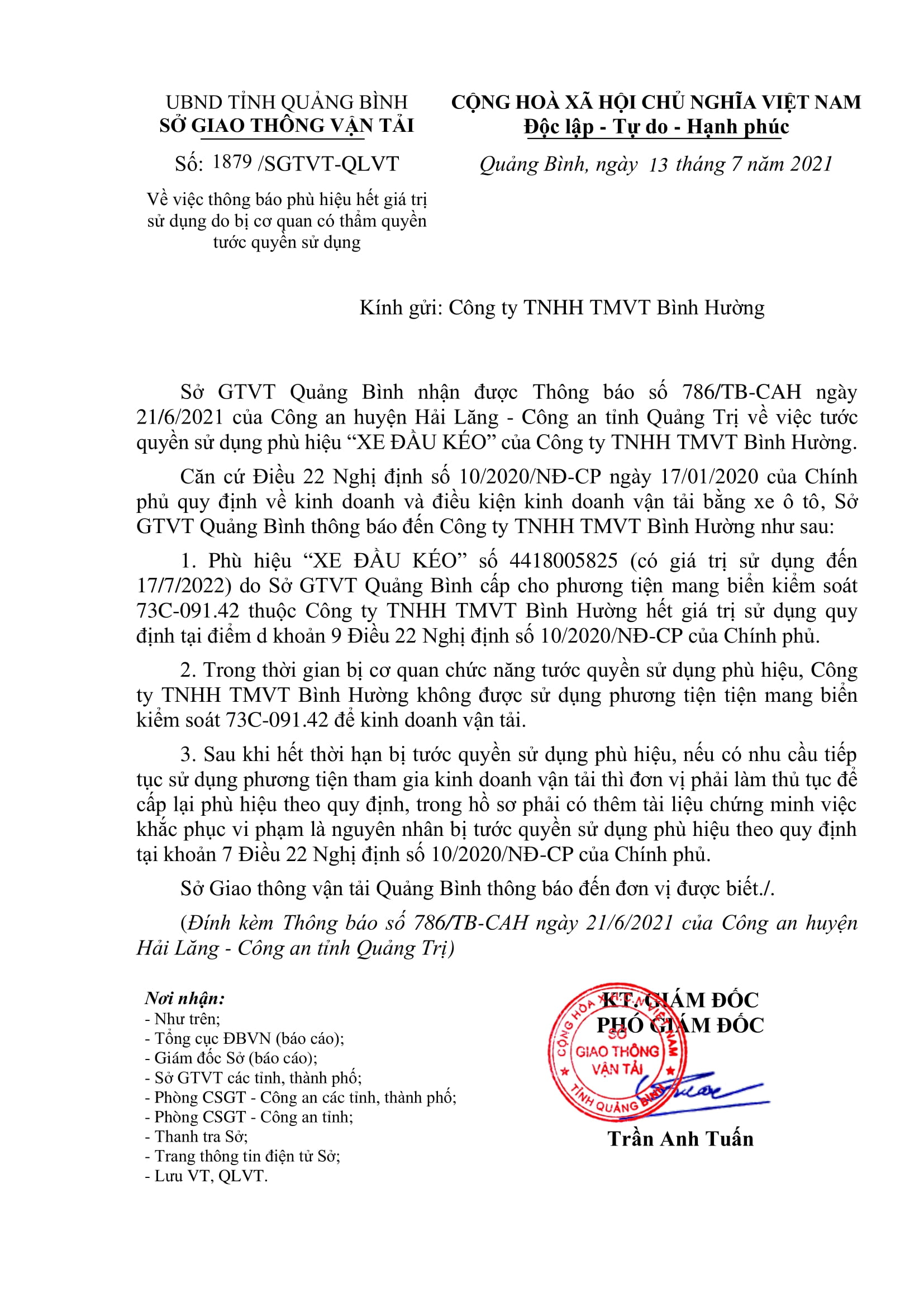 Thông báo phù hiệu hết giá trị sử dụng do bị cơ quan có thẩm quyền tước quyền sử dụng của Công ty TNHH TMVT Bình Hường