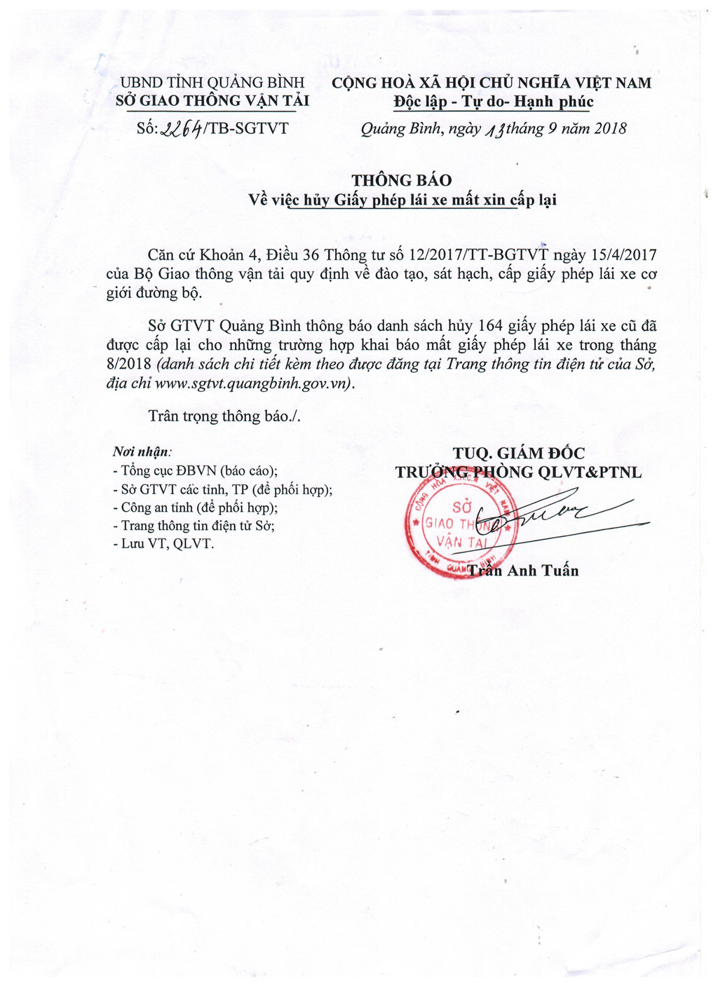 Thông báo về việc hủy Giấy phép lái xe mất xin cấp lại (Tháng 08/2018)