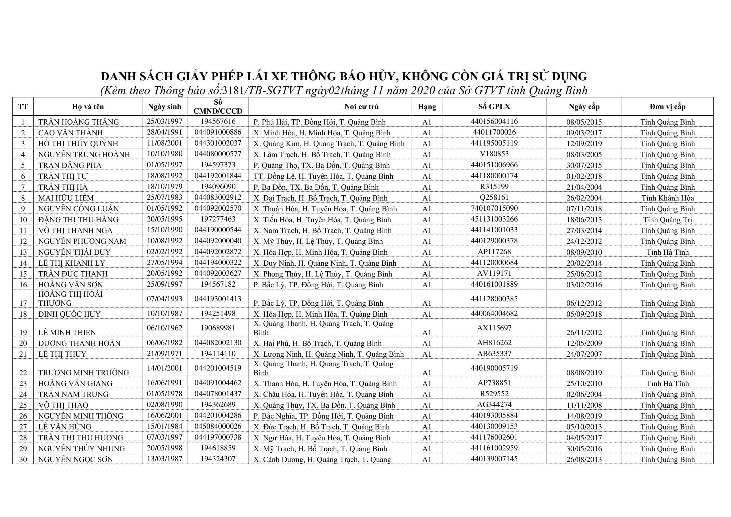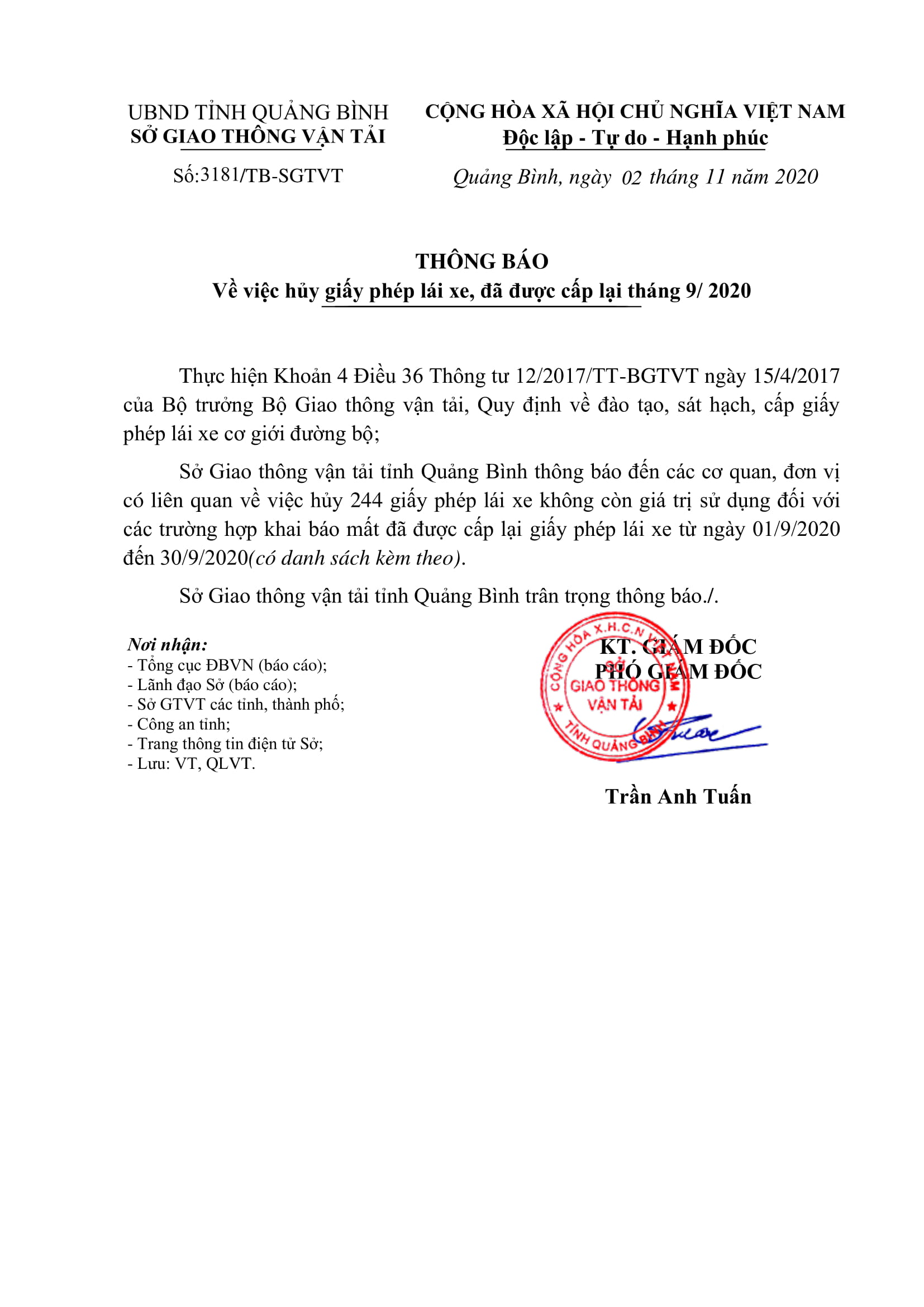 Thông báo hủy Giấy phép lái xe, đã được cấp lại trong tháng 9/2020