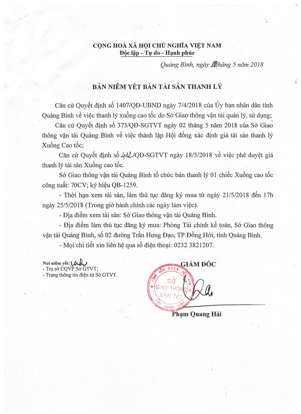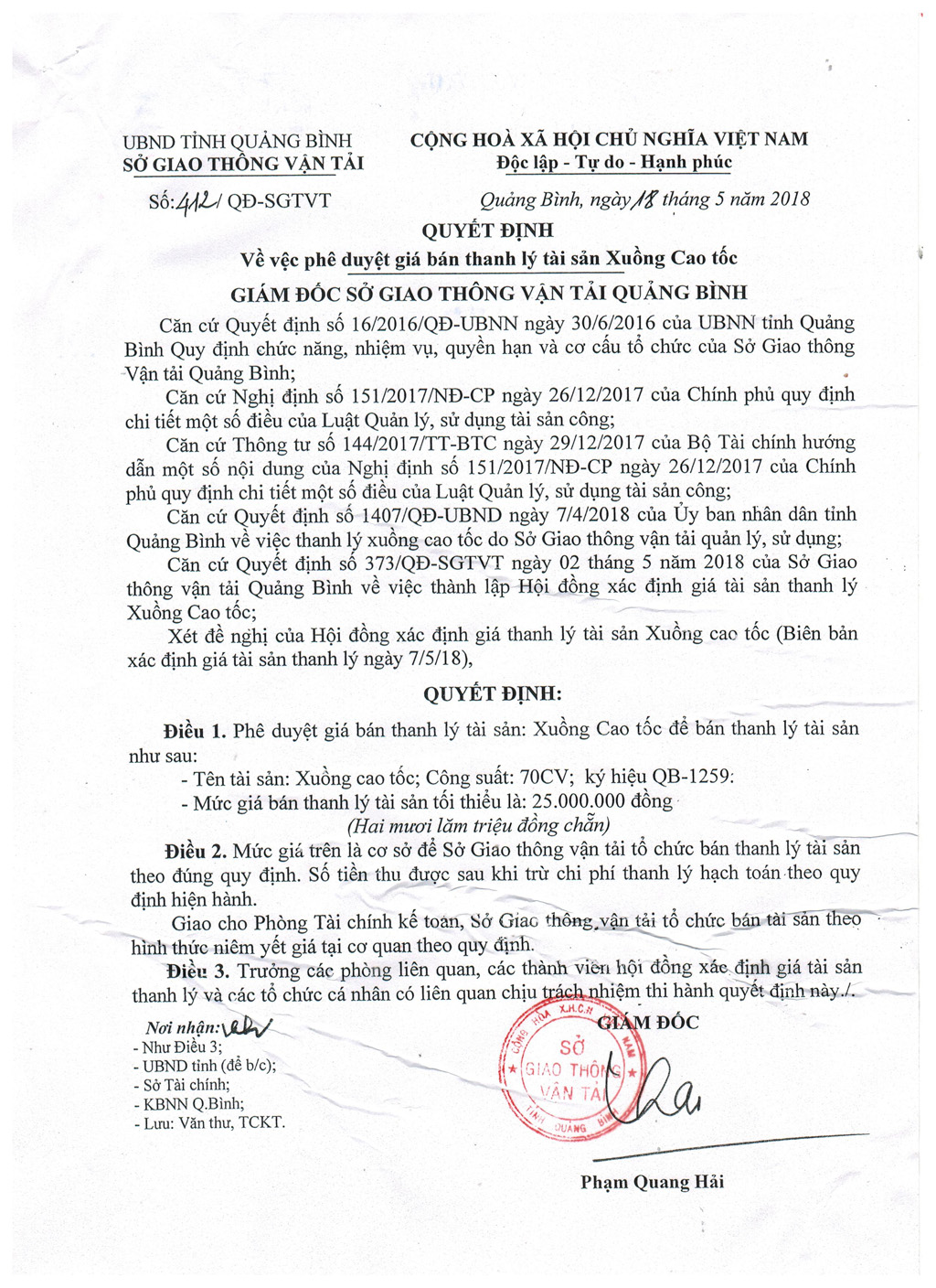 Quyết định phê duyệt giá bán thanh lý tài sản Xuồng Cao tốc