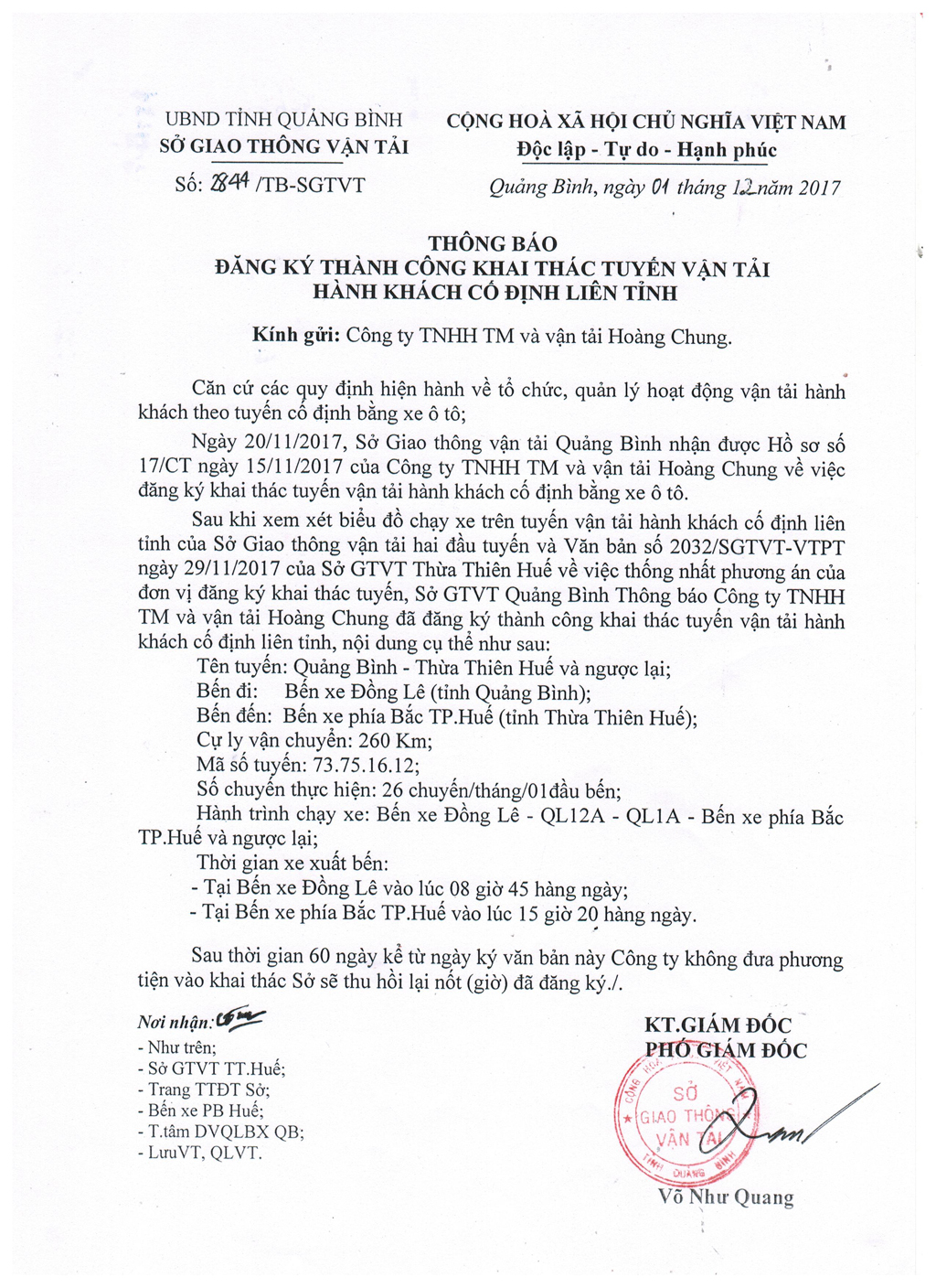 Thông báo Đăng ký thành công khai thác tuyến vận tải hành khách cố định liên tỉnh của Công ty TNHH TM và vận tải Hoàng Chung (tuyến Quảng Bình - Thừa Thiên Huế-và ngược lại)