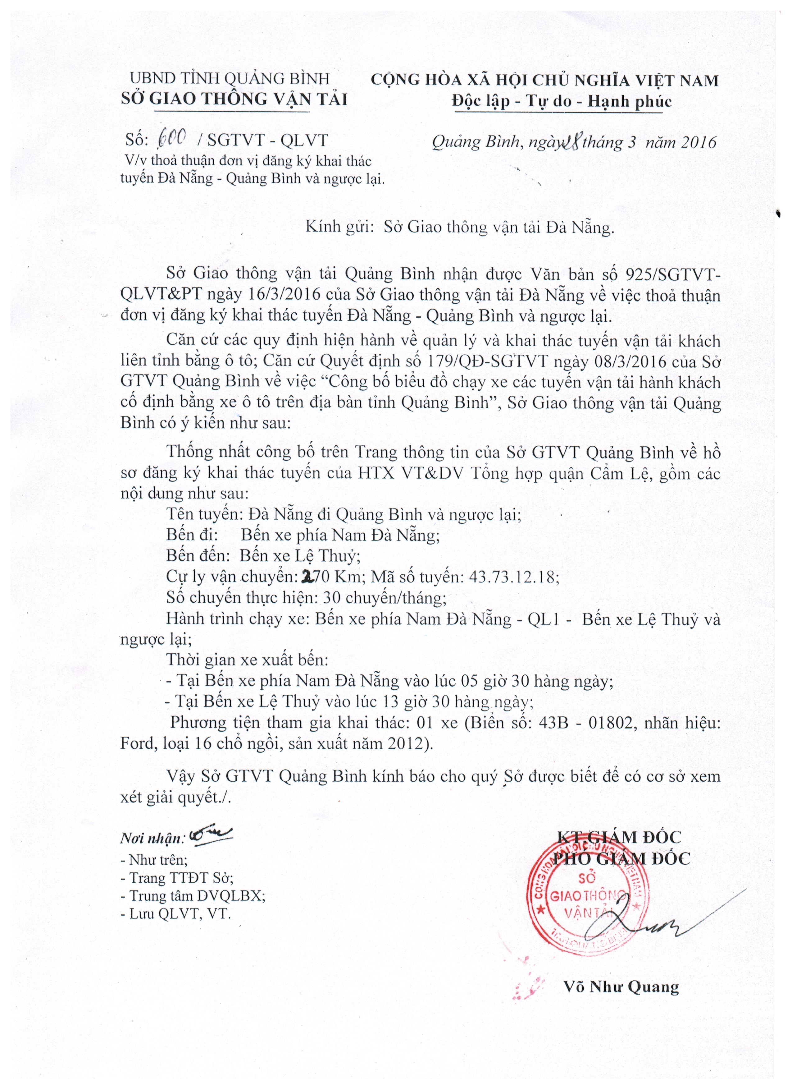 Thỏa thuận đơn vị đăng ký khai thác tuyến Đà Nẵng - Quảng Bình và ngược lại của Hợp tác xã Vận tải và Dịch vụ Tổng hợp quận Cẩm Lệ