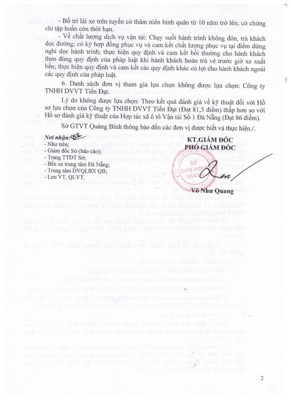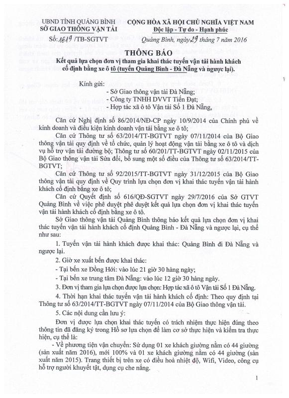 Thông báo kết quả lựa chọn đơn vị tham gia khai thác tuyến vận tải hành khách cố định bằng ô tô (tuyến Quảng Bình - Đà Nẵng và ngược lại)