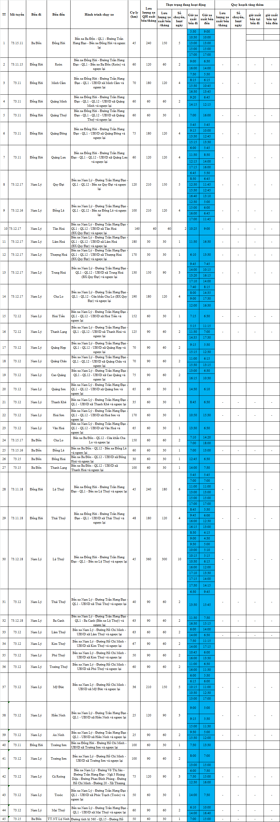 BIỂU ĐỒ CHẠY XE CÁC TUYẾN NỘI TỈNH