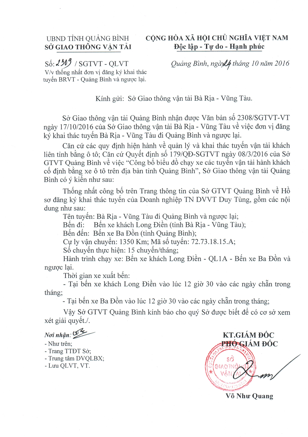 Thông báo thống nhất đơn vị đăng ký khai thác tuyến Bà Rịa Vũng Tàu - Quảng Bình và ngược lại