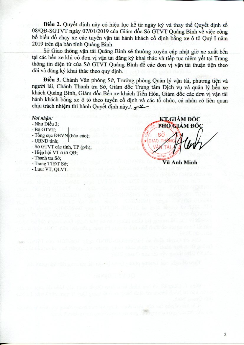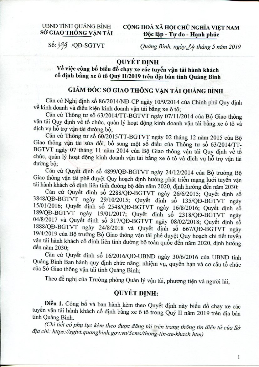 Quyết định công bố biểu đồ chạy xe các tuyến vận tải hành khách cố định bằng xe ô tô Quí II/2019 trên địa bàn tỉnh Quảng Bình