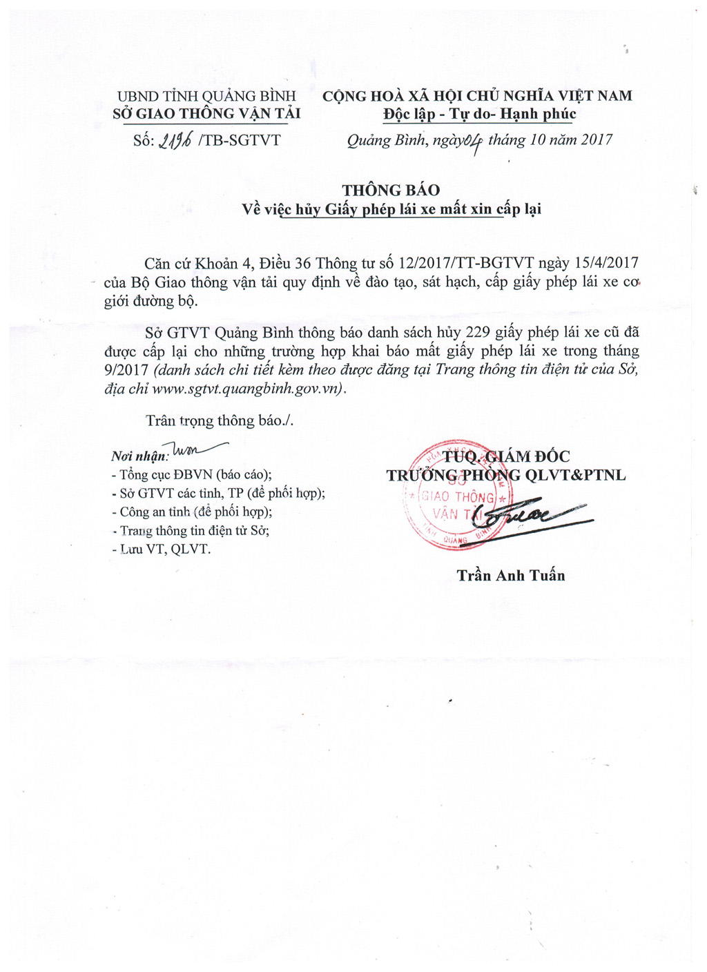 Thông báo về việc hủy Giấy phép lái xe mất xin cấp lại (Tháng 9/2017)