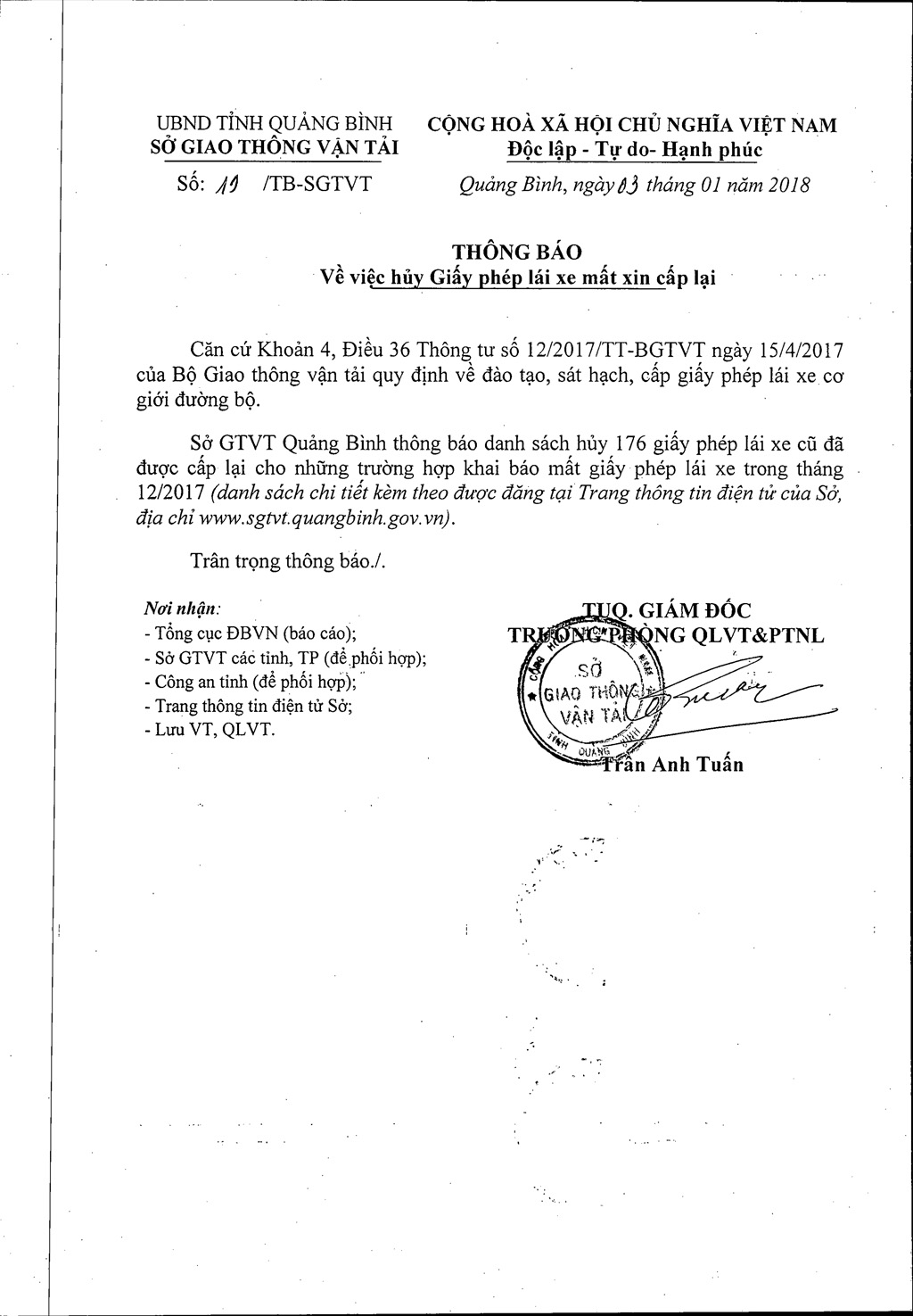 Thông báo về việc hủy Giấy phép lái xe mất xin cấp lại (Tháng 12/2017)