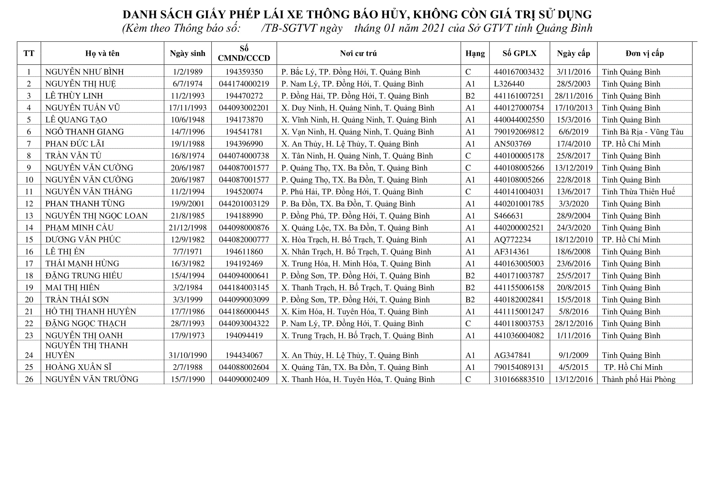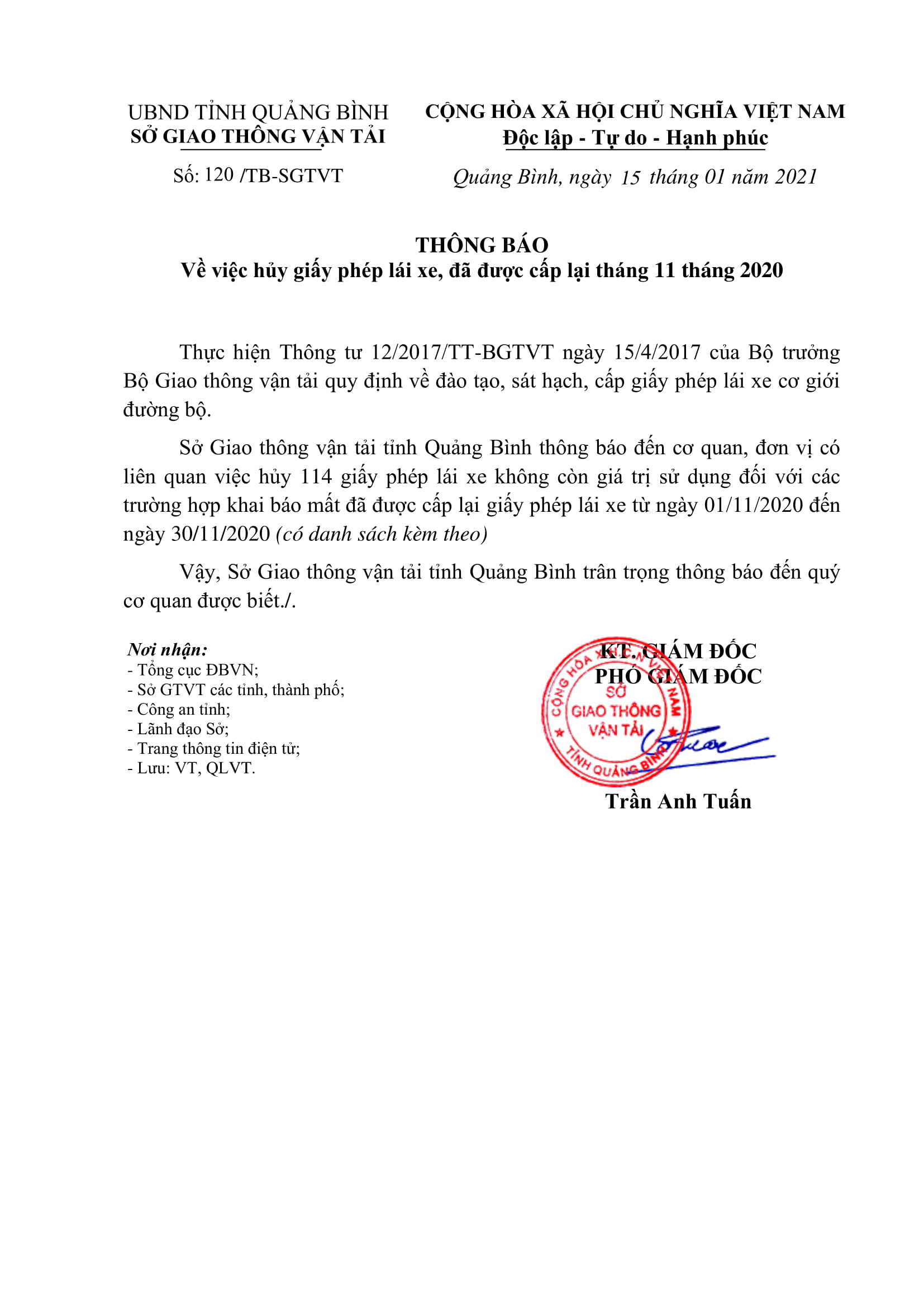 Thông báo hủy Giấy phép lái xe bị mất, đã được cấp lại tháng 11/2020