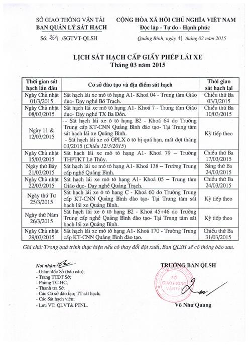 Lịch sát hạch cấp Giấy phép lái xe tháng 03 năm 2015