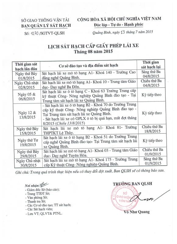 Lịch sát hạch cấp Giấy phép lái xe tháng 08 năm 2015