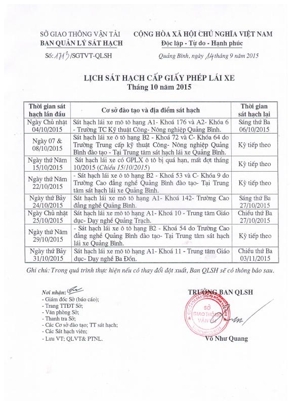 - Lịch sát hạch cấp Giấy phép lái xe tháng 09 năm 2015 (27/08/2015)