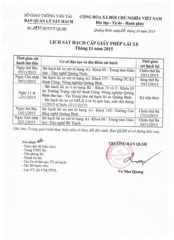 Lịch sát hạch cấp Giấy phép lái xe tháng 11 năm 2015