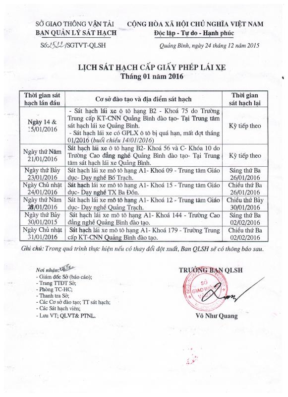 Lịch sát hạch cấp Giấy phép lái xe tháng 01 năm 2016