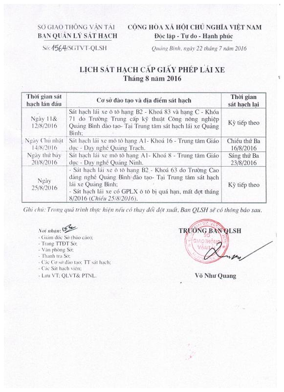 Lịch sát hạch cấp Giấy phép lái xe tháng 08 năm 2016
