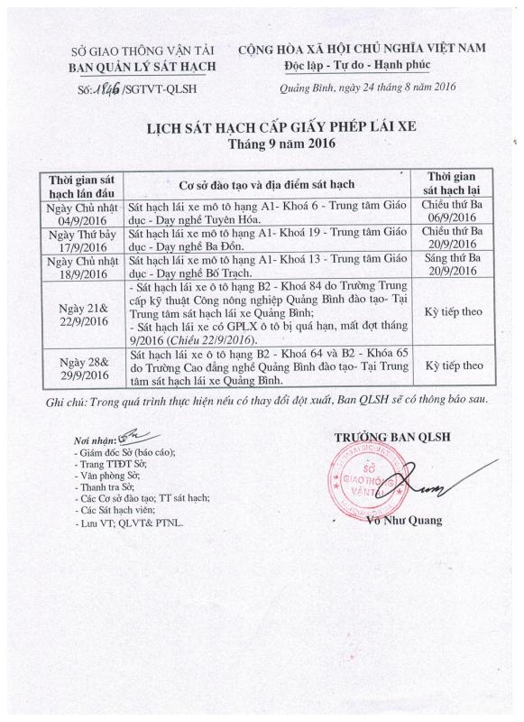 Lịch sát hạch cấp Giấy phép lái xe tháng 09 năm 2016