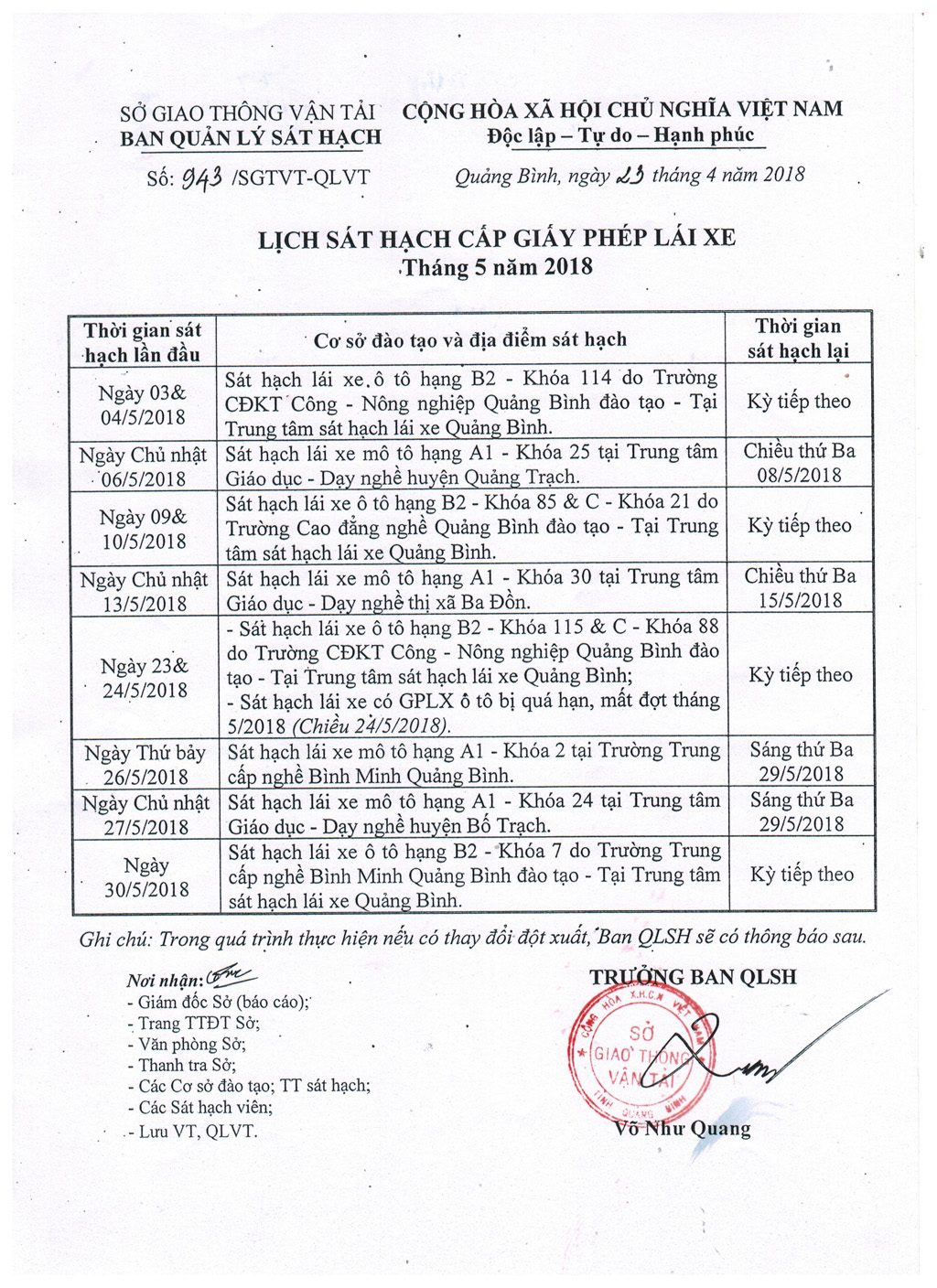 Lịch sát hạch cấp Giấy phép lái xe tháng 05 năm 2018