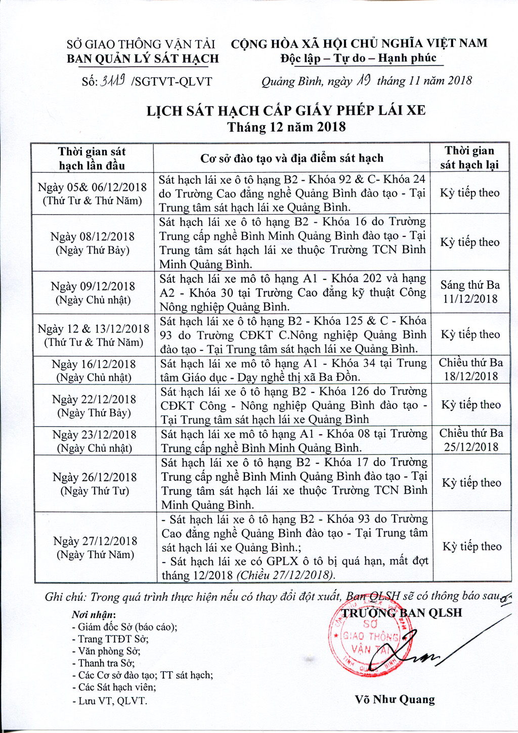 Lịch sát hạch cấp Giấy phép lái xe tháng 12 năm 2018