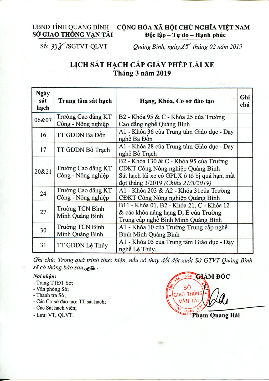 Lịch sát hạch cấp Giấy phép lái xe tháng 03 năm 2019