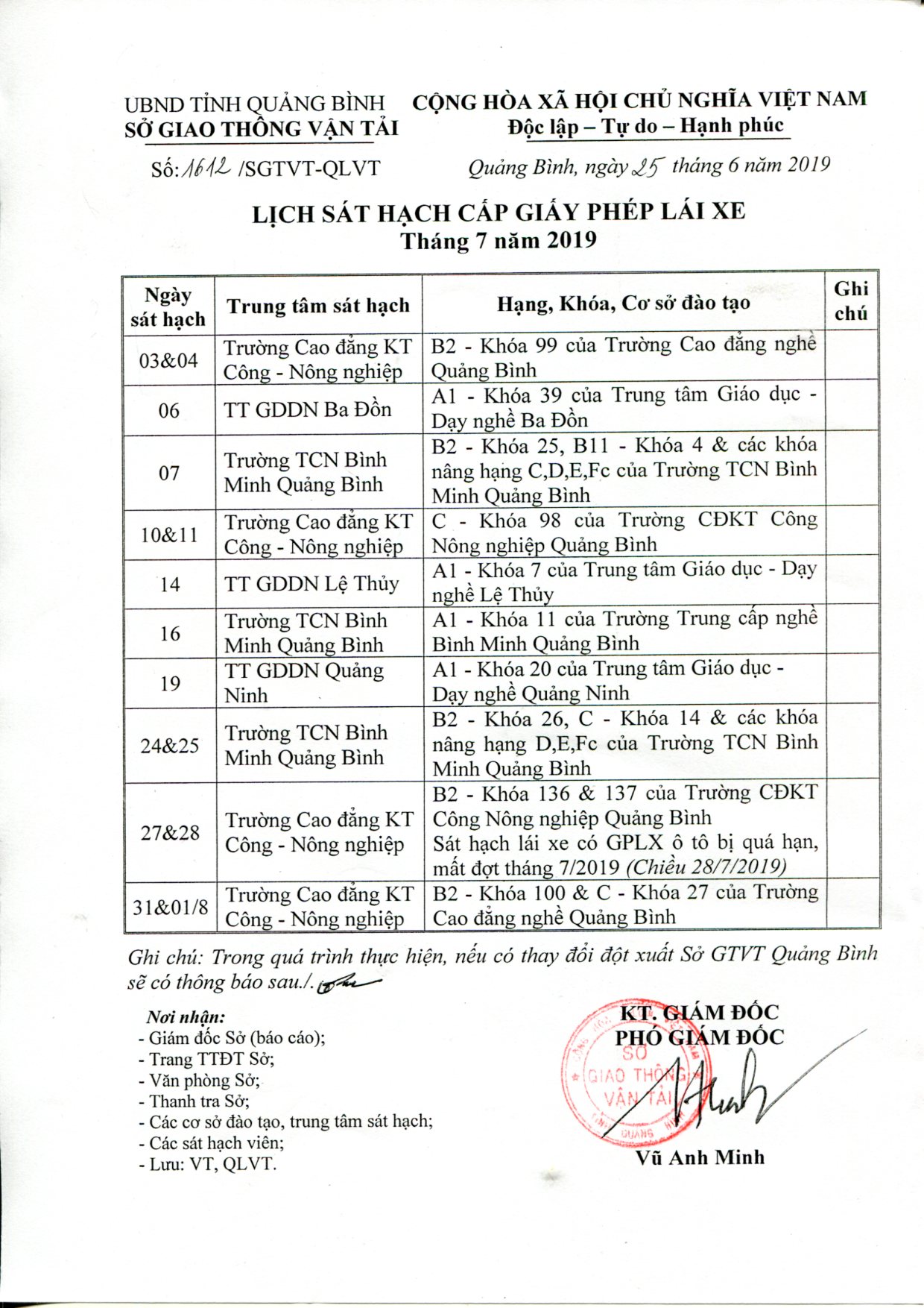 Lịch sát hạch cấp Giấy phép lái xe tháng 07 năm 2019