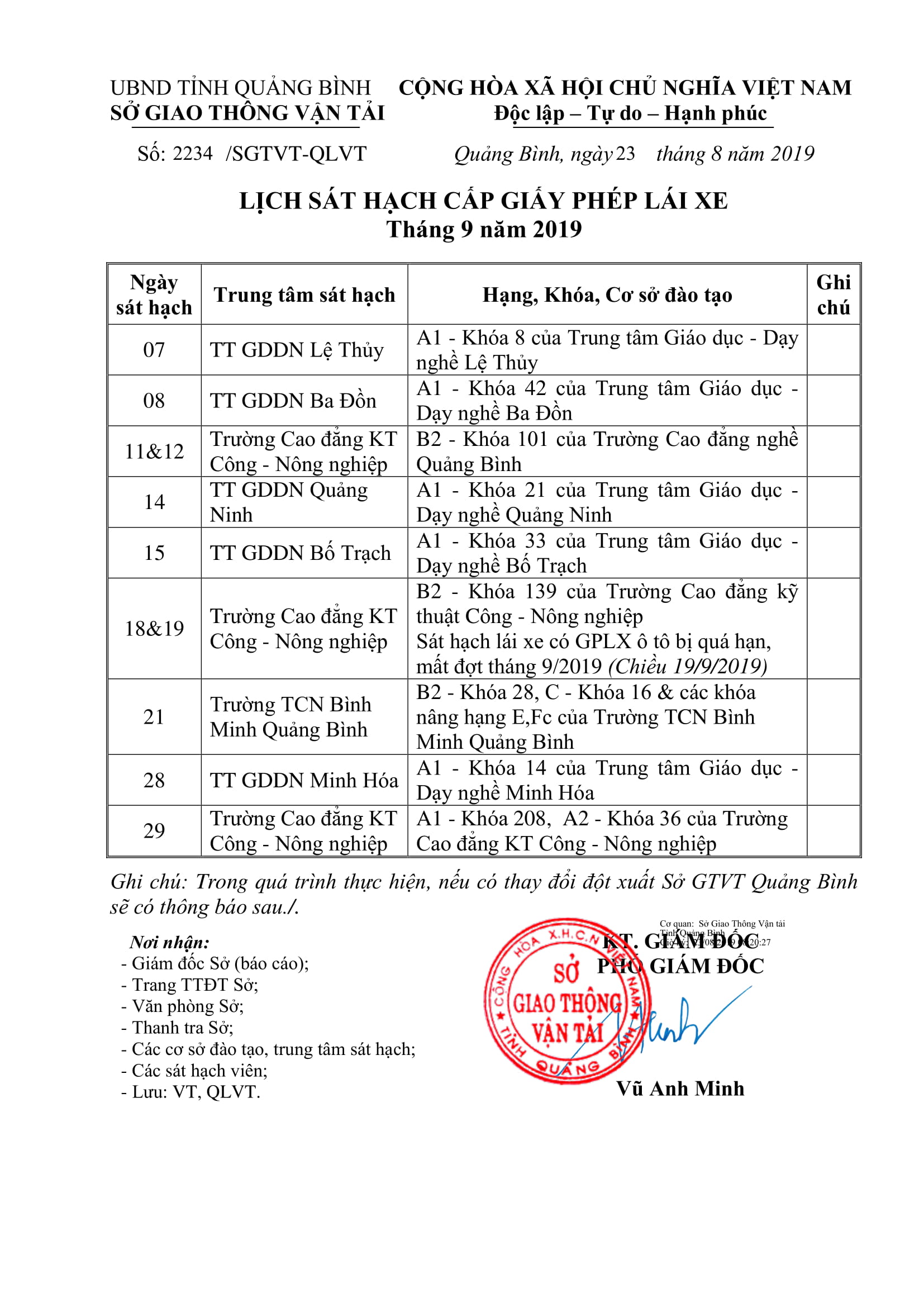 Lịch sát hạch cấp Giấy phép lái xe tháng 09 năm 2019
