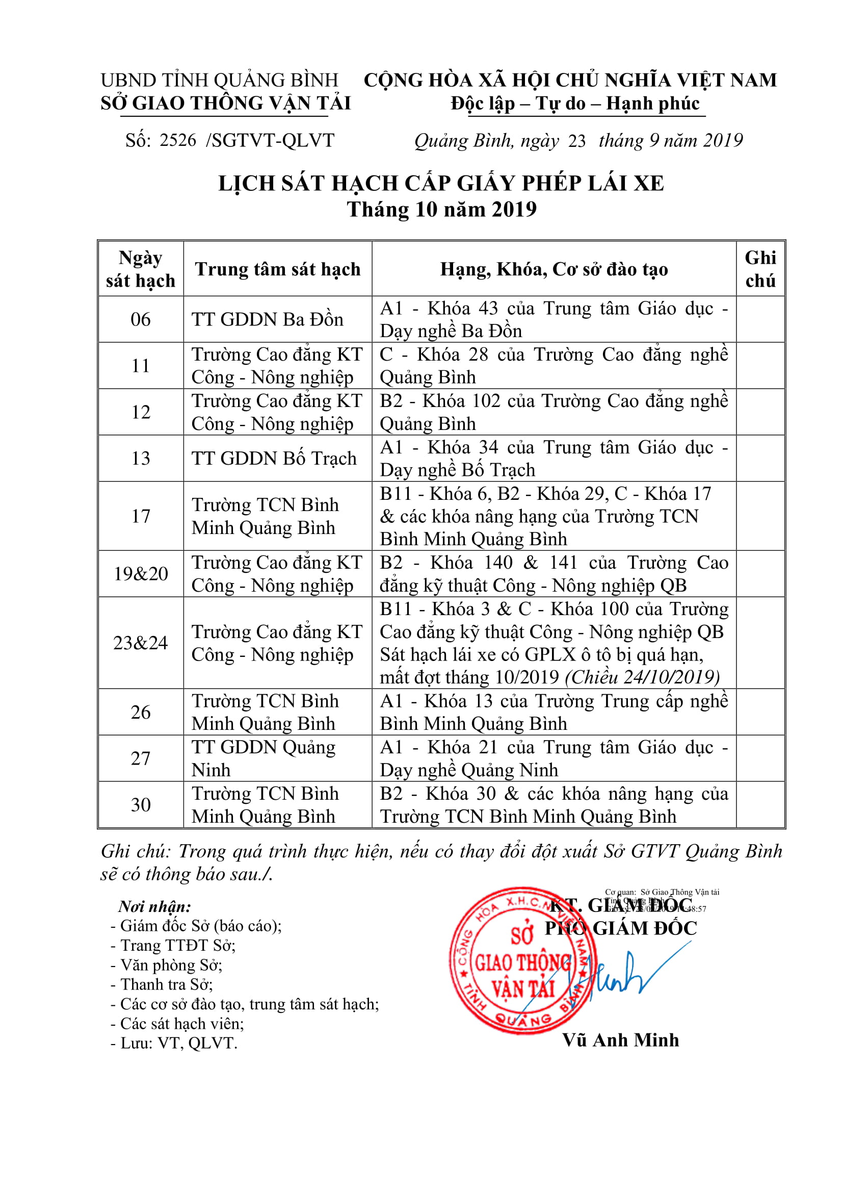 Lịch sát hạch cấp Giấy phép lái xe tháng 10 năm 2019