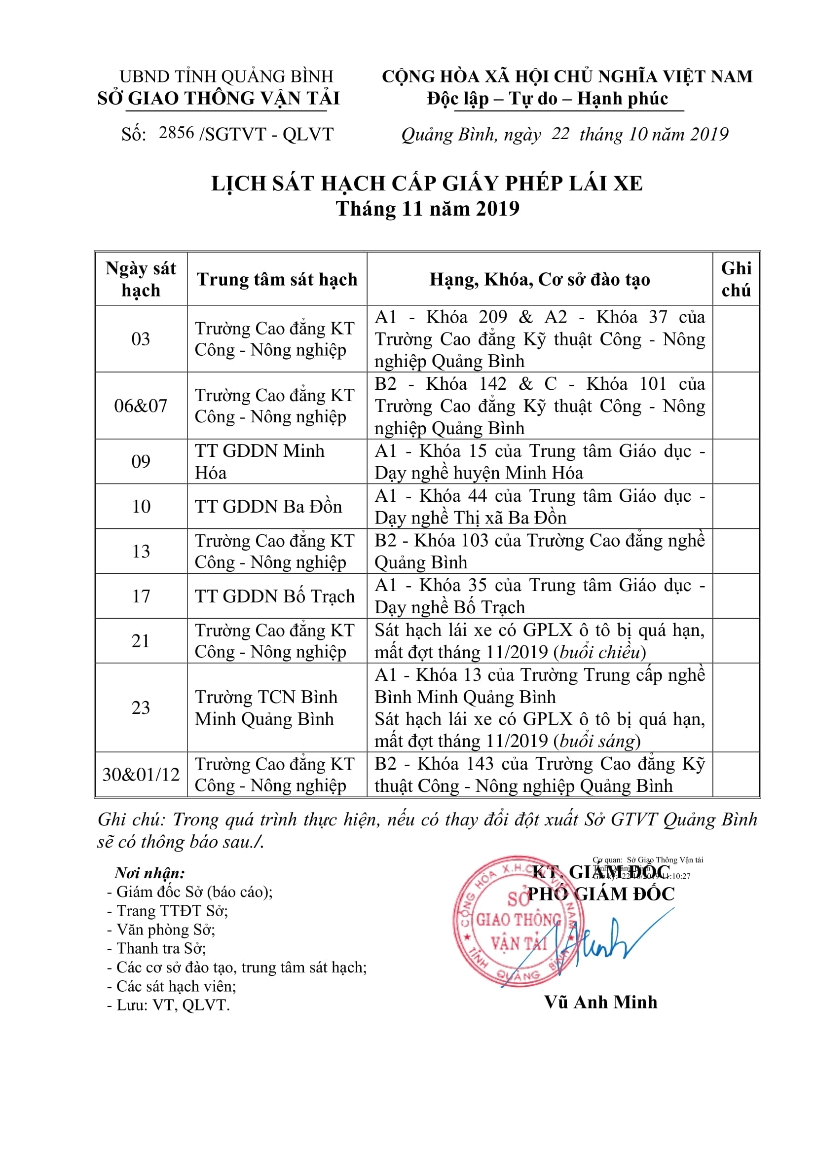 Lịch sát hạch cấp Giấy phép lái xe tháng 11 năm 2019