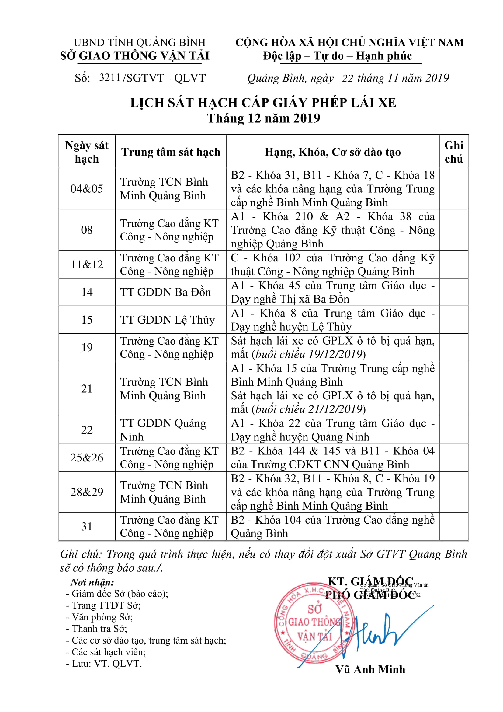 Lịch sát hạch cấp Giấy phép lái xe tháng 12 năm 2019