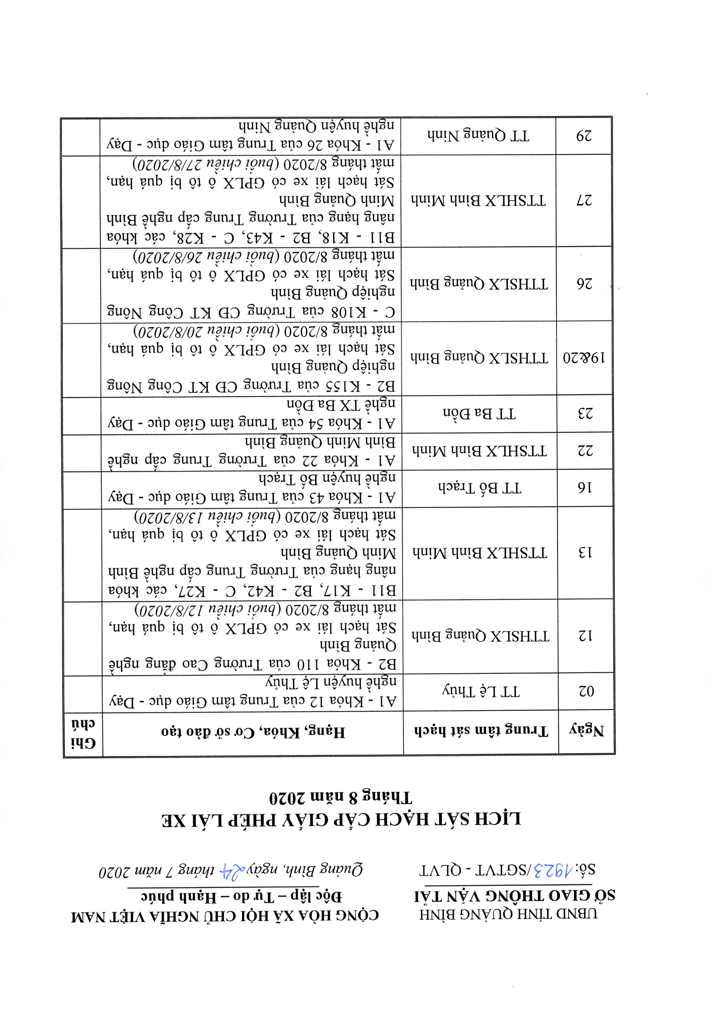 Lịch sát hạch Giấy phép lái xe tháng 08/2020
