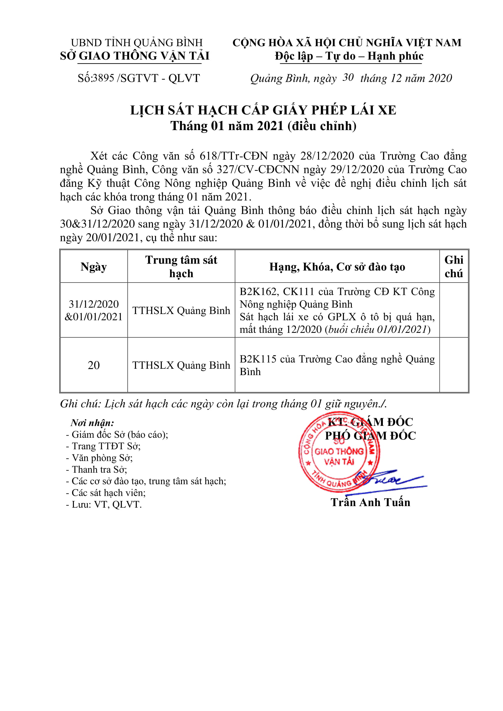 Lịch sát hạch Giấy phép lái xe điều chỉnh tháng 01/20201