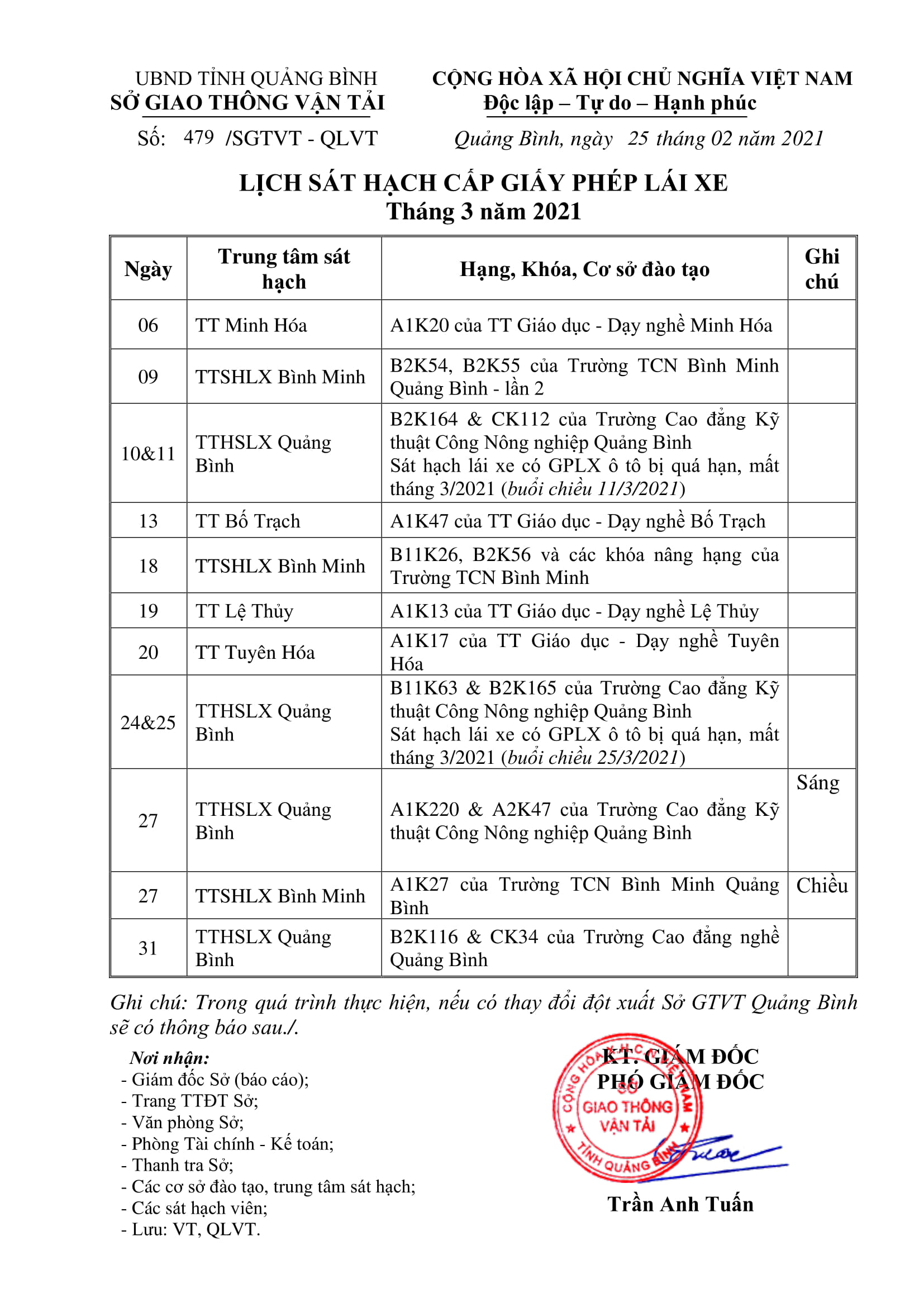 Lịch sát hạch Giấy phép lái xe tháng 03/2020