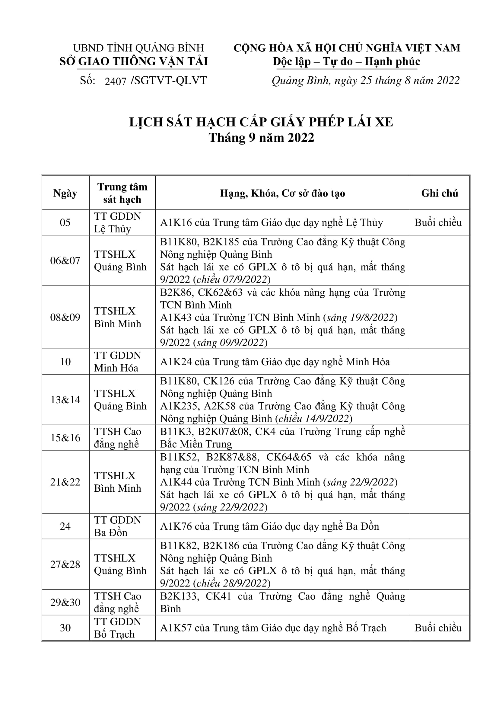 Lịch sát hạch Giấy phép lái xe tháng 9/2022