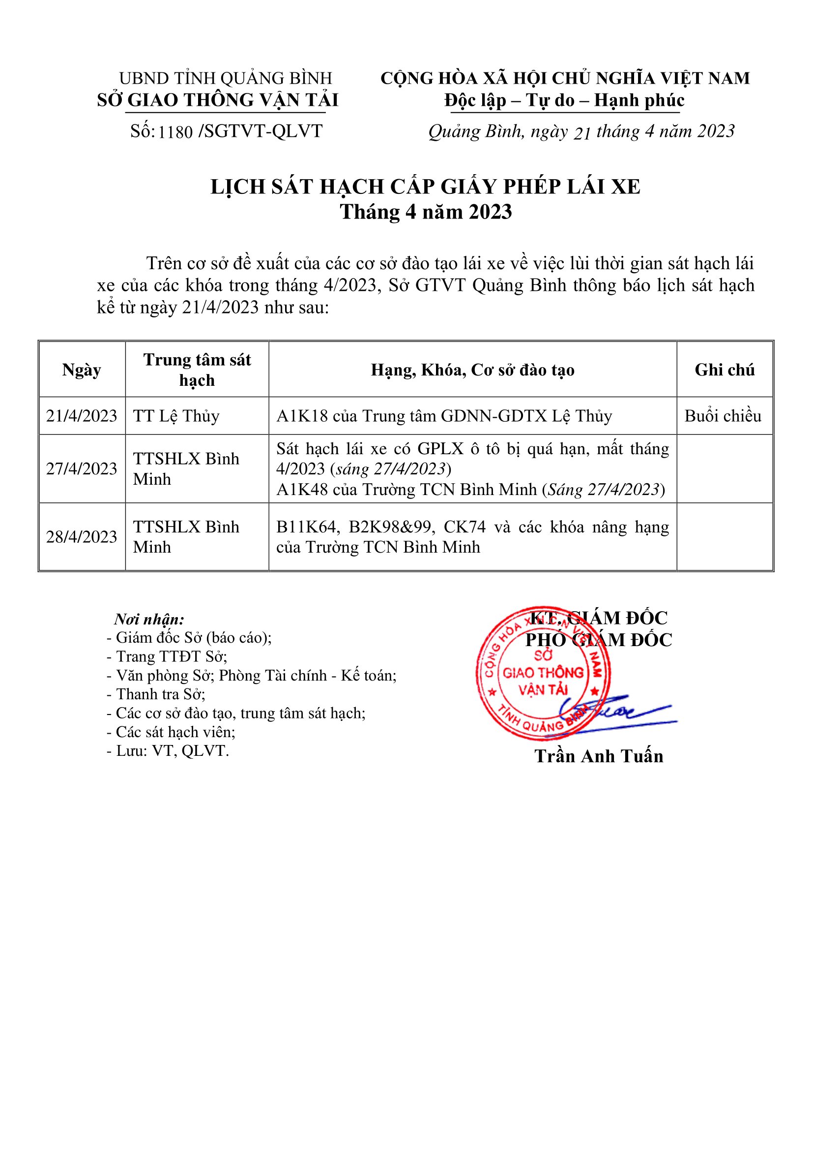 Lịch sát hạch Giấy phép lái xe tháng 04/2023 (Điều chỉnh lần 3)
