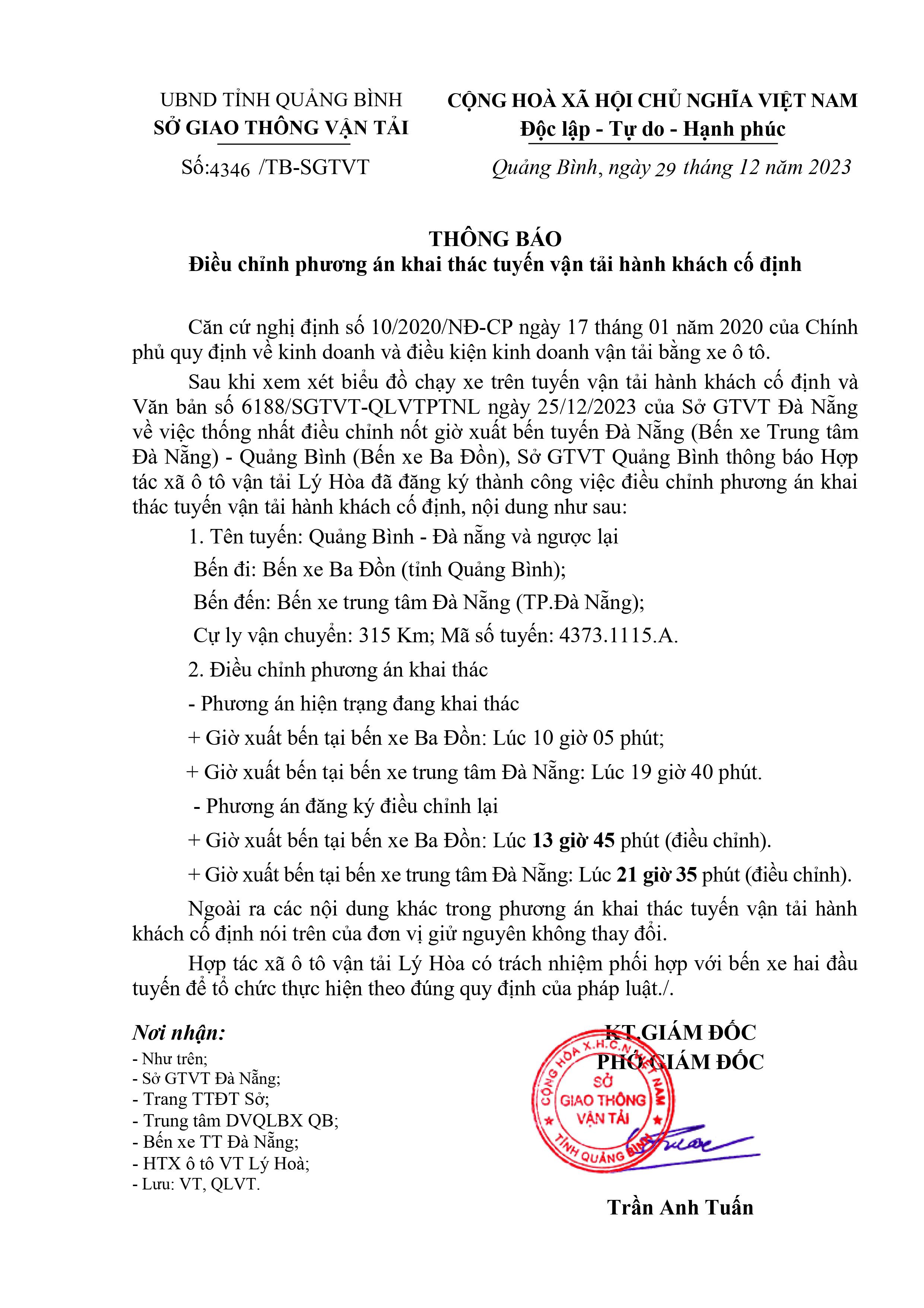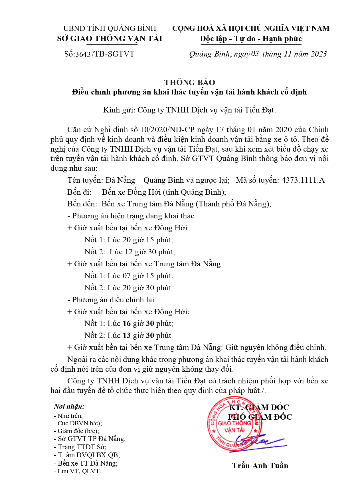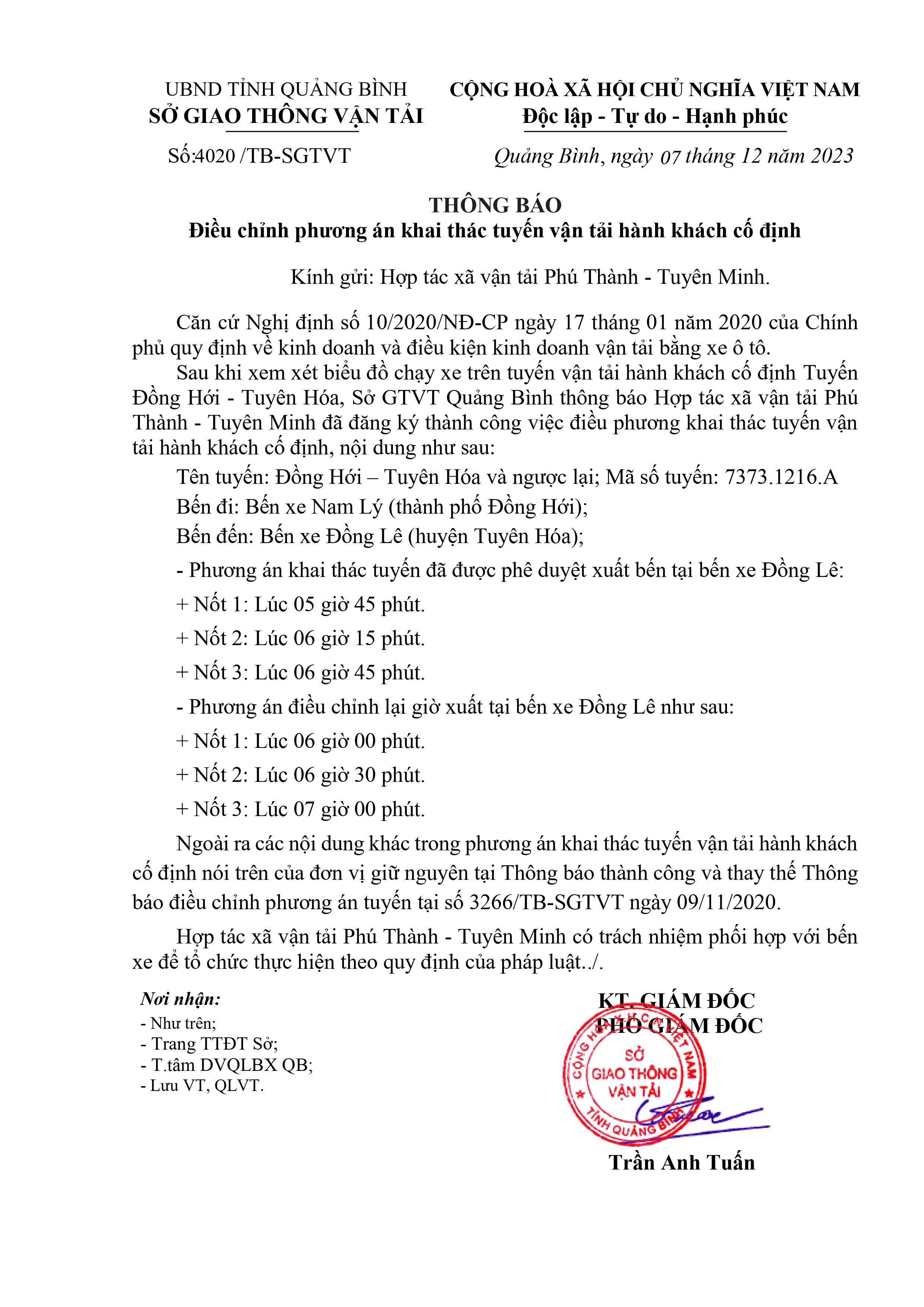 Thông báo điều chỉnh phương án khai thác tuyến vận tải hành khách cố định
